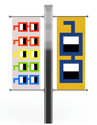 0.75 ETH Nouns Pole Banners — Four double-sided 2x5' pole banners and hangers, to install in pairs on two utility poles on site