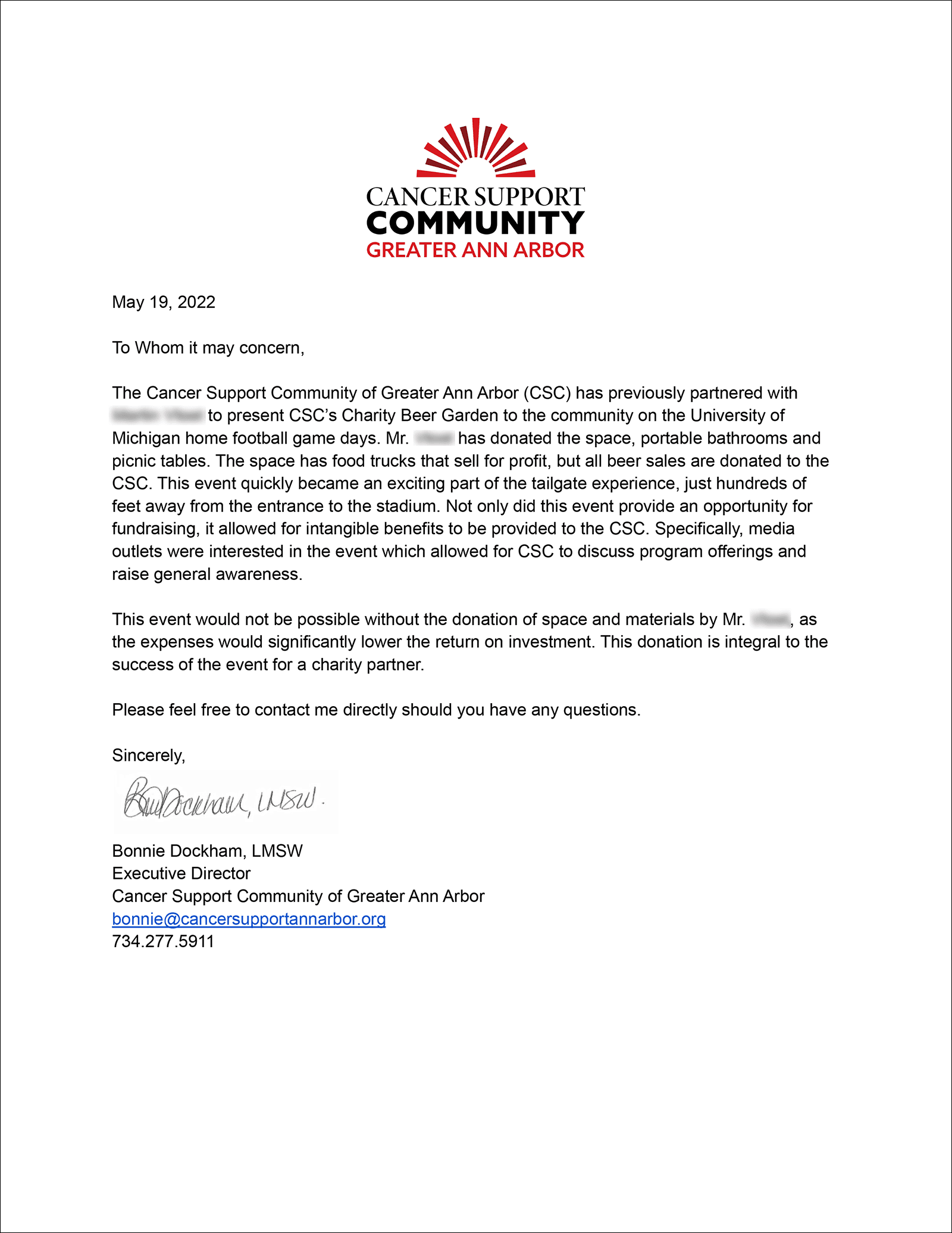 **Cancer Support Community** — the local chapter of the national 501(c)(3) non-profit organization is our co-host, securing the state special permit for alcohol service at the beer garden; CSC volunteers staff the event and pour drinks.