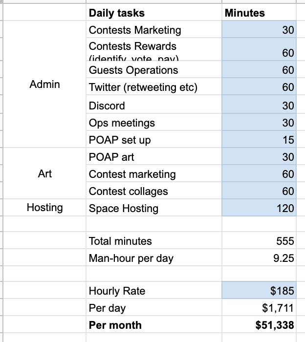 Based on our pilot, we estimated how many man-hours it takes to run a show like this every day. We think these are reasonable overall estimates.