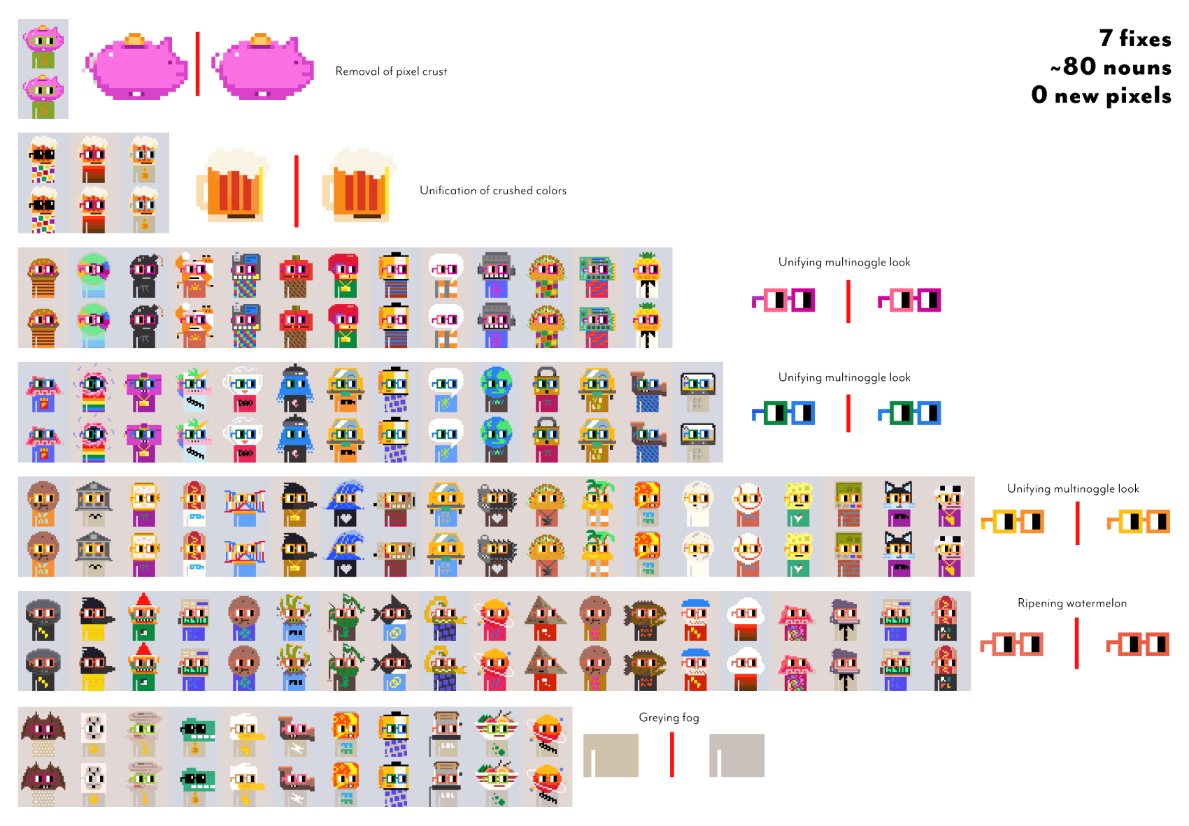 In addition, we’ve retroactively fixed seven art errors and oversights. These fixes will not only apply to art moving forward, but will reach back in time to correct Nouns that contain the offending traits. All fixes are either recoloring of existing pixels or removing of extra pixels. Most errors are likely a result of iteration and palette color reduction prior to the launch of Nouns - some that melded two colors into one, or put two formerly-different colors closer to one another. No pixels are being added in this update. Emoji voting in discord indicated support for this effort.