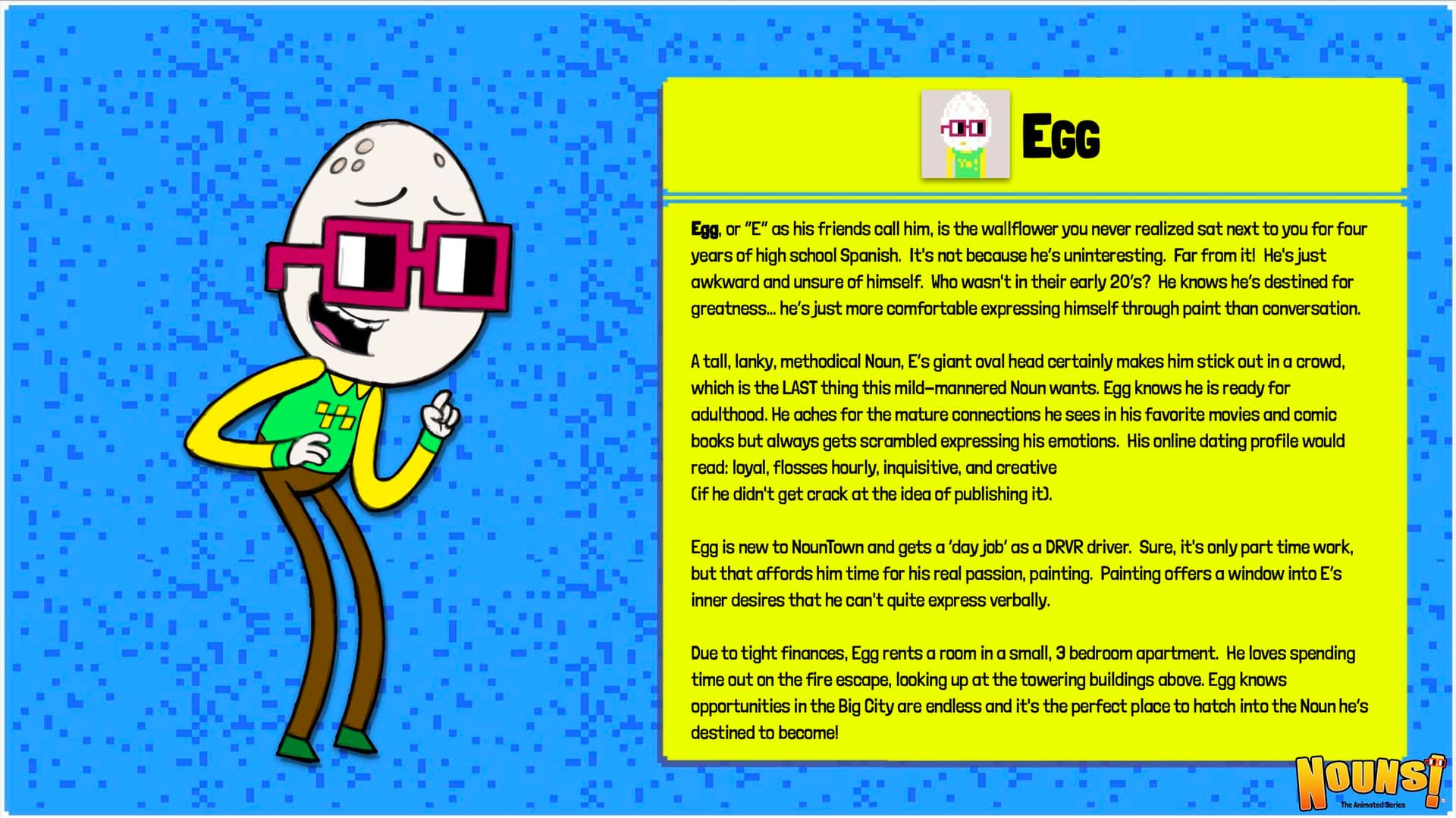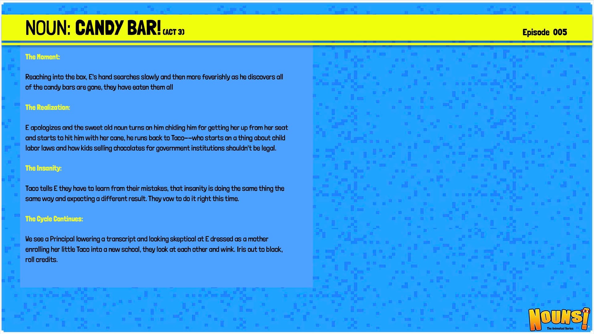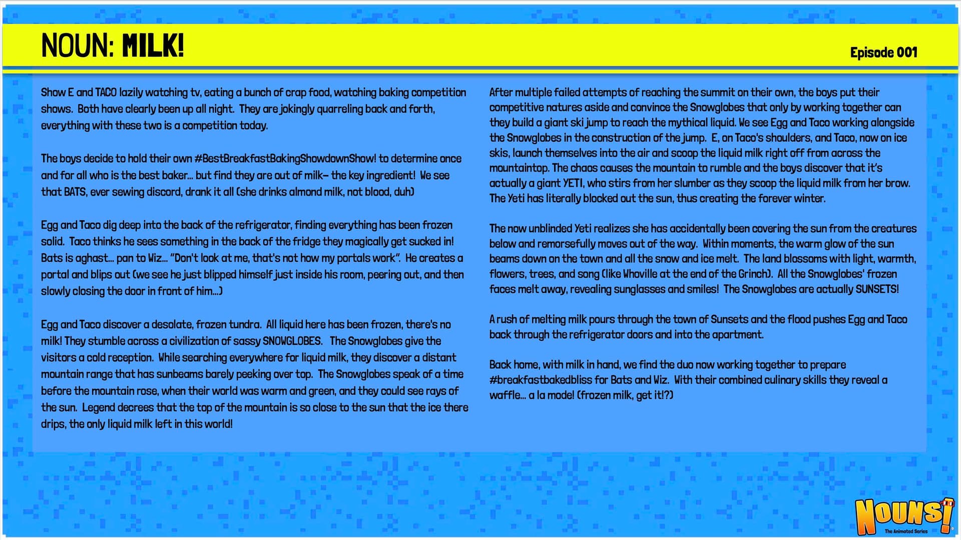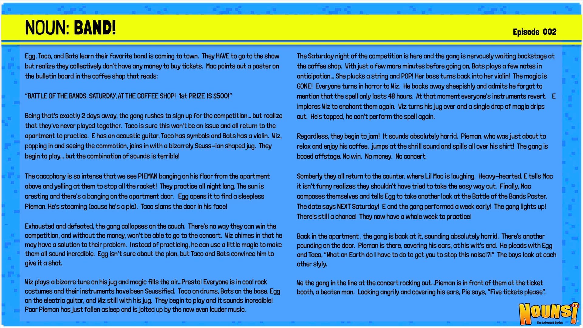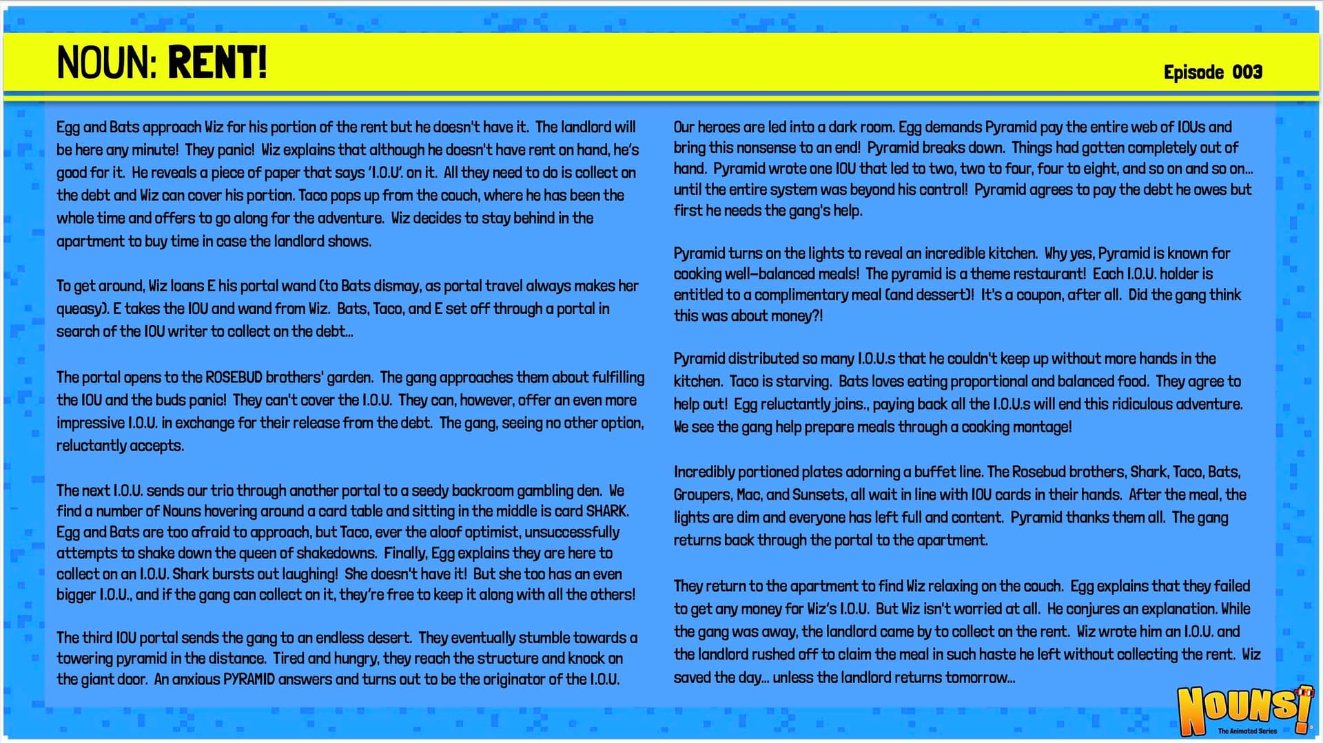 Nouns! An Animated Pilot is a 2D tradigital animated 11-minute episode as seen in the Prop 70 (CC0 Pitchbook). The show is an animated comedy following the surreal adventures of best friends balancing the desire for mature adulthood and their reluctance to grow up.