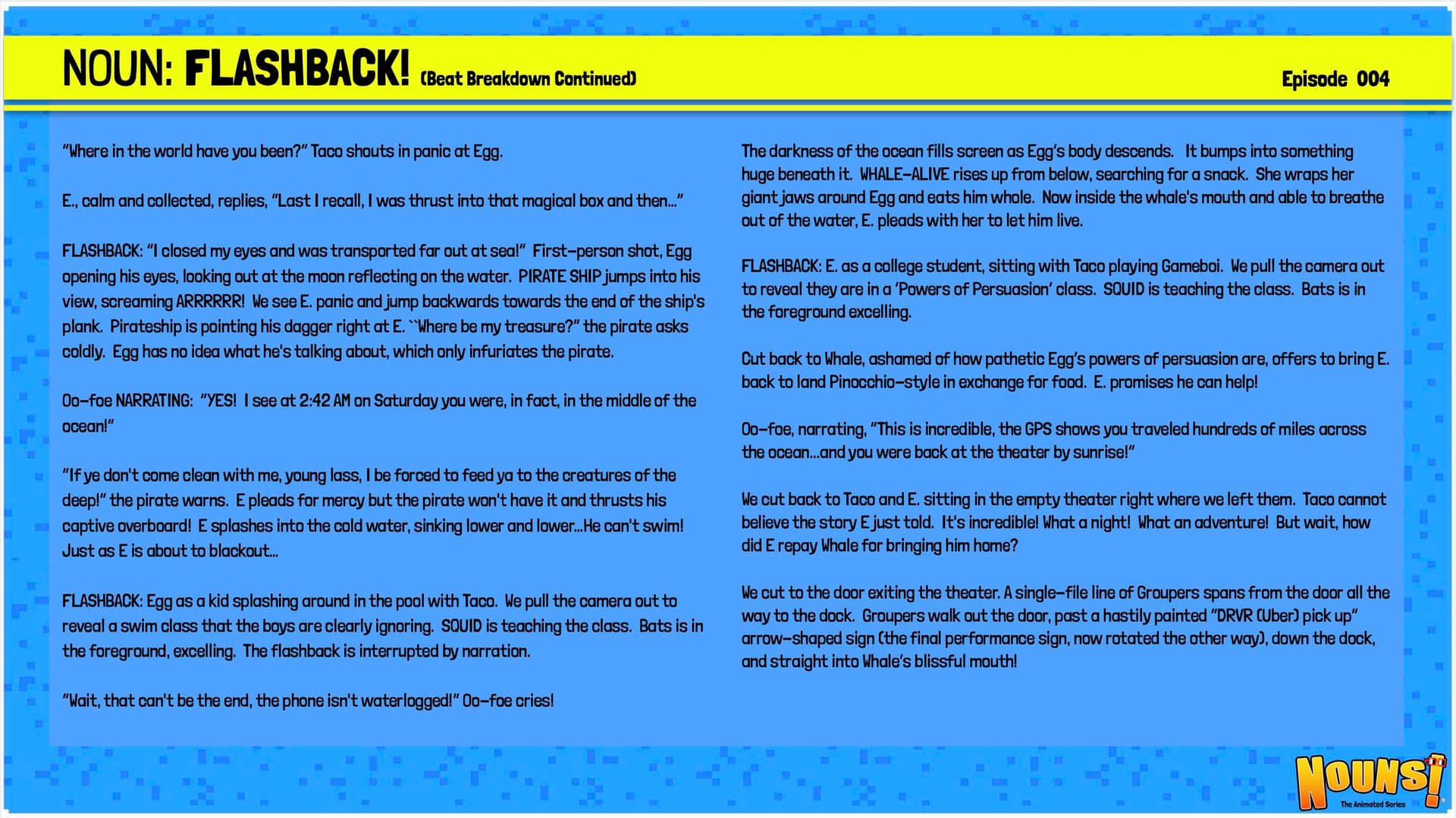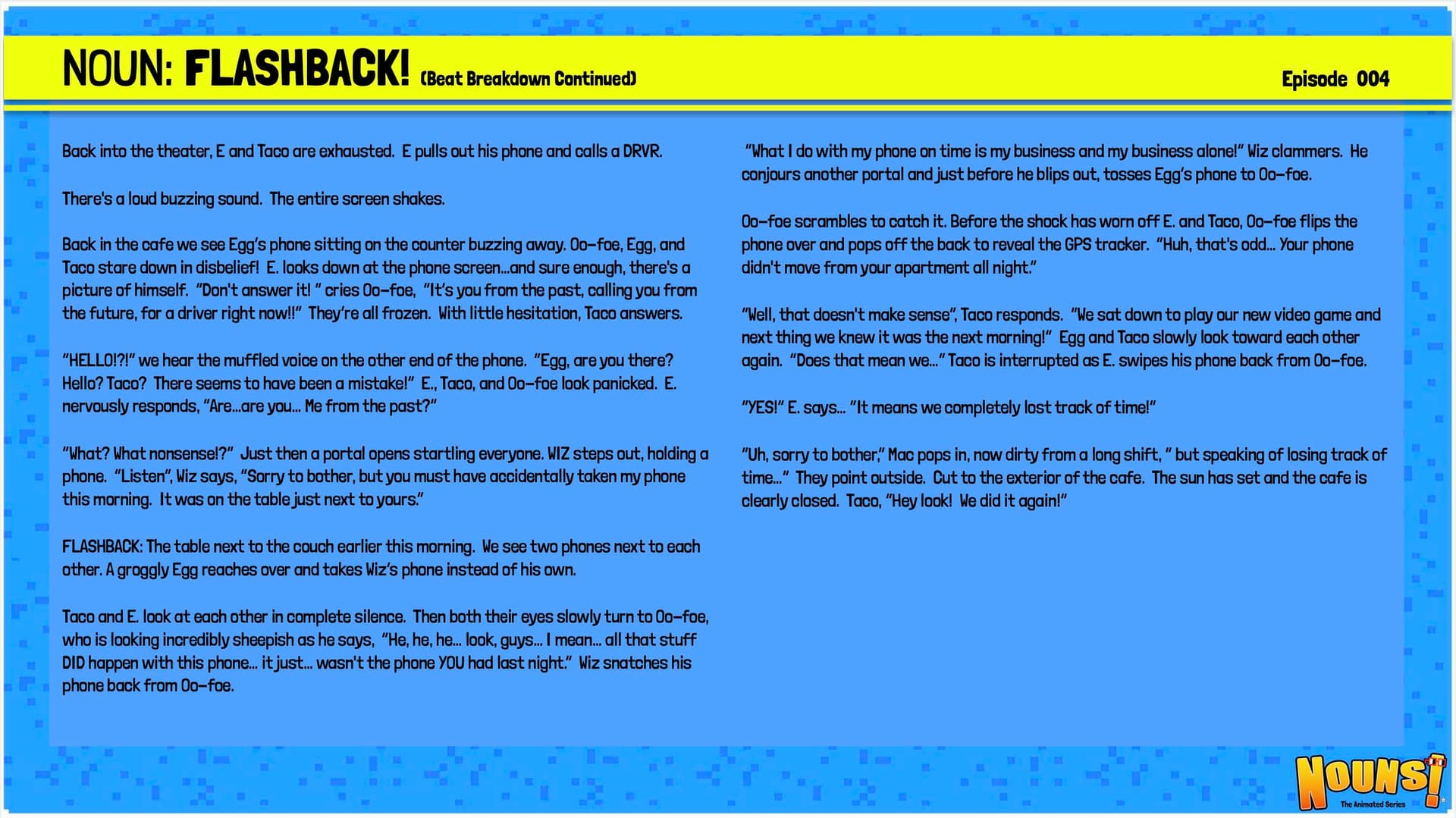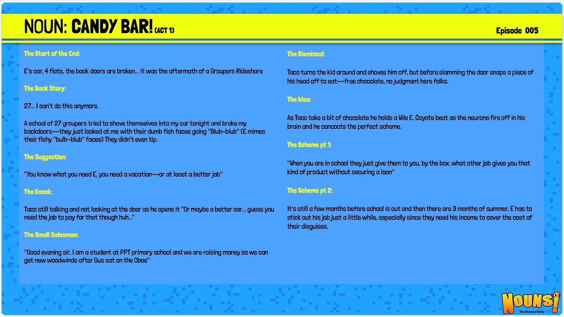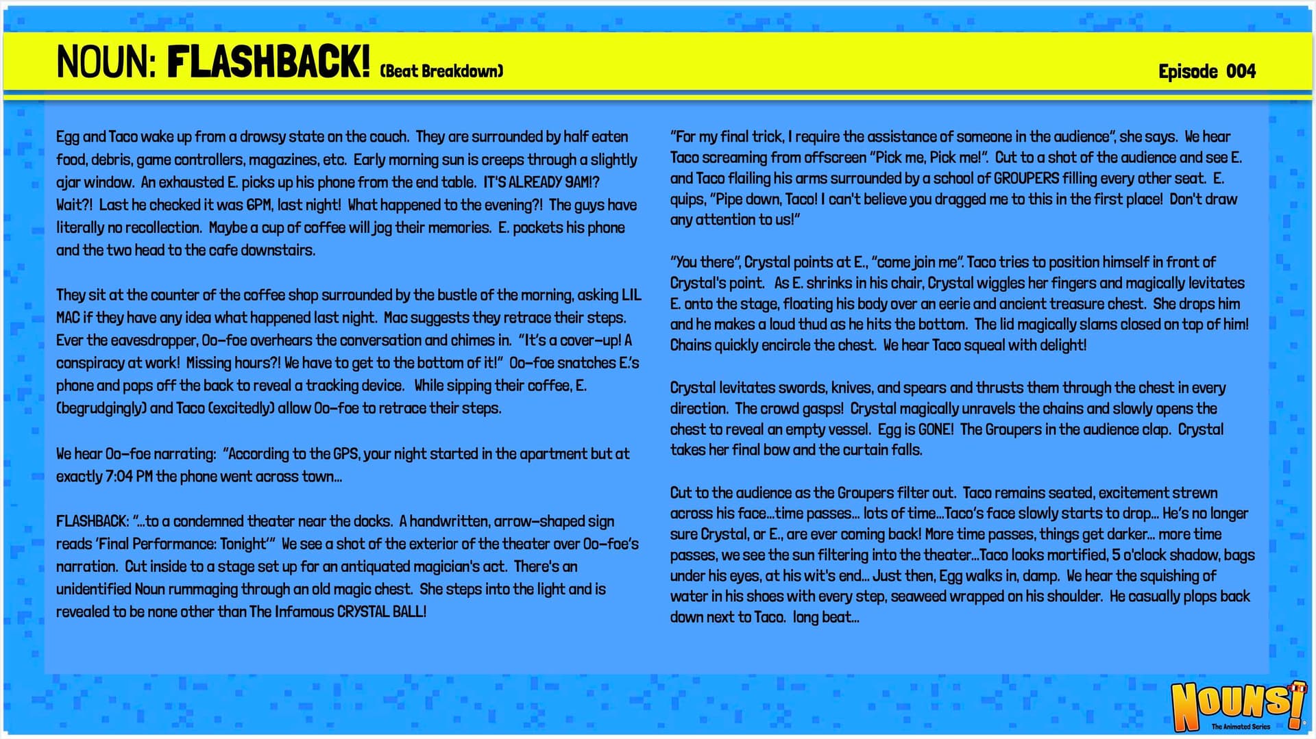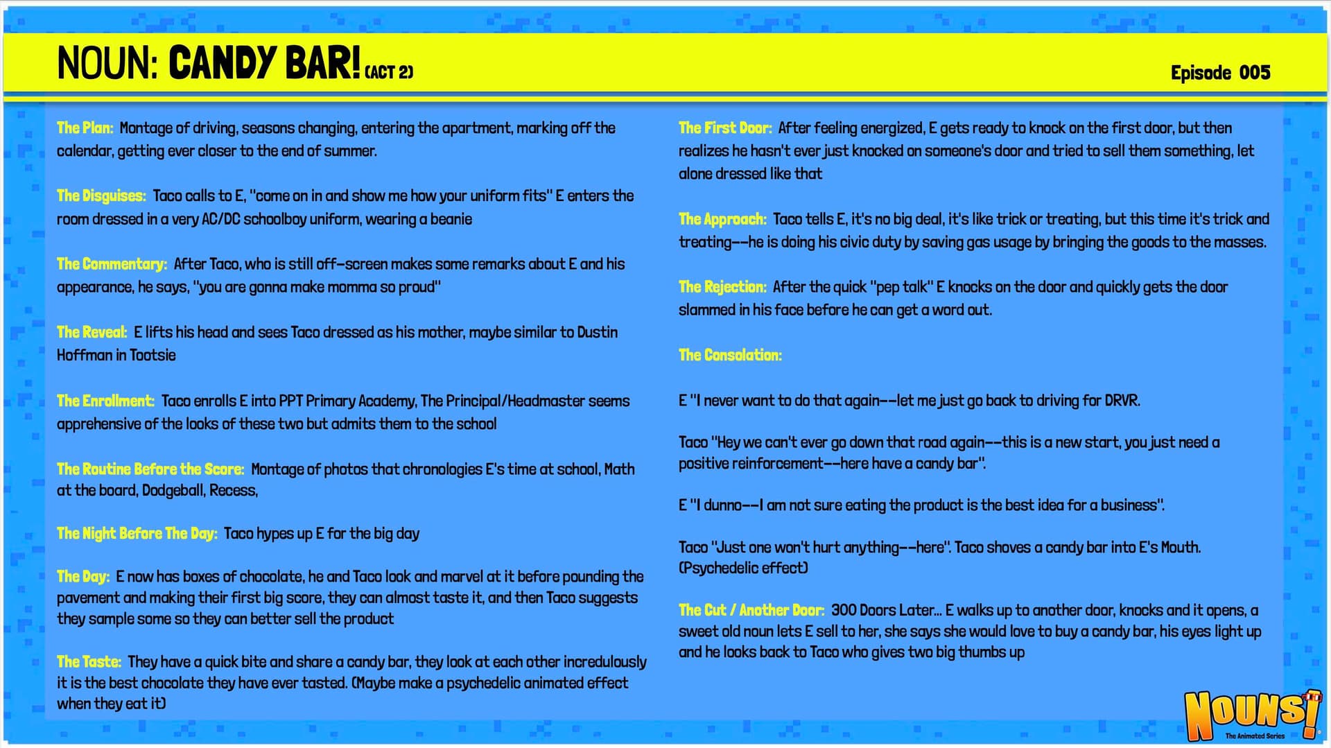Nouns! An Animated Pilot is a 2D tradigital animated 11-minute episode as seen in the Prop 70 (CC0 Pitchbook). The show is an animated comedy following the surreal adventures of best friends balancing the desire for mature adulthood and their reluctance to grow up.