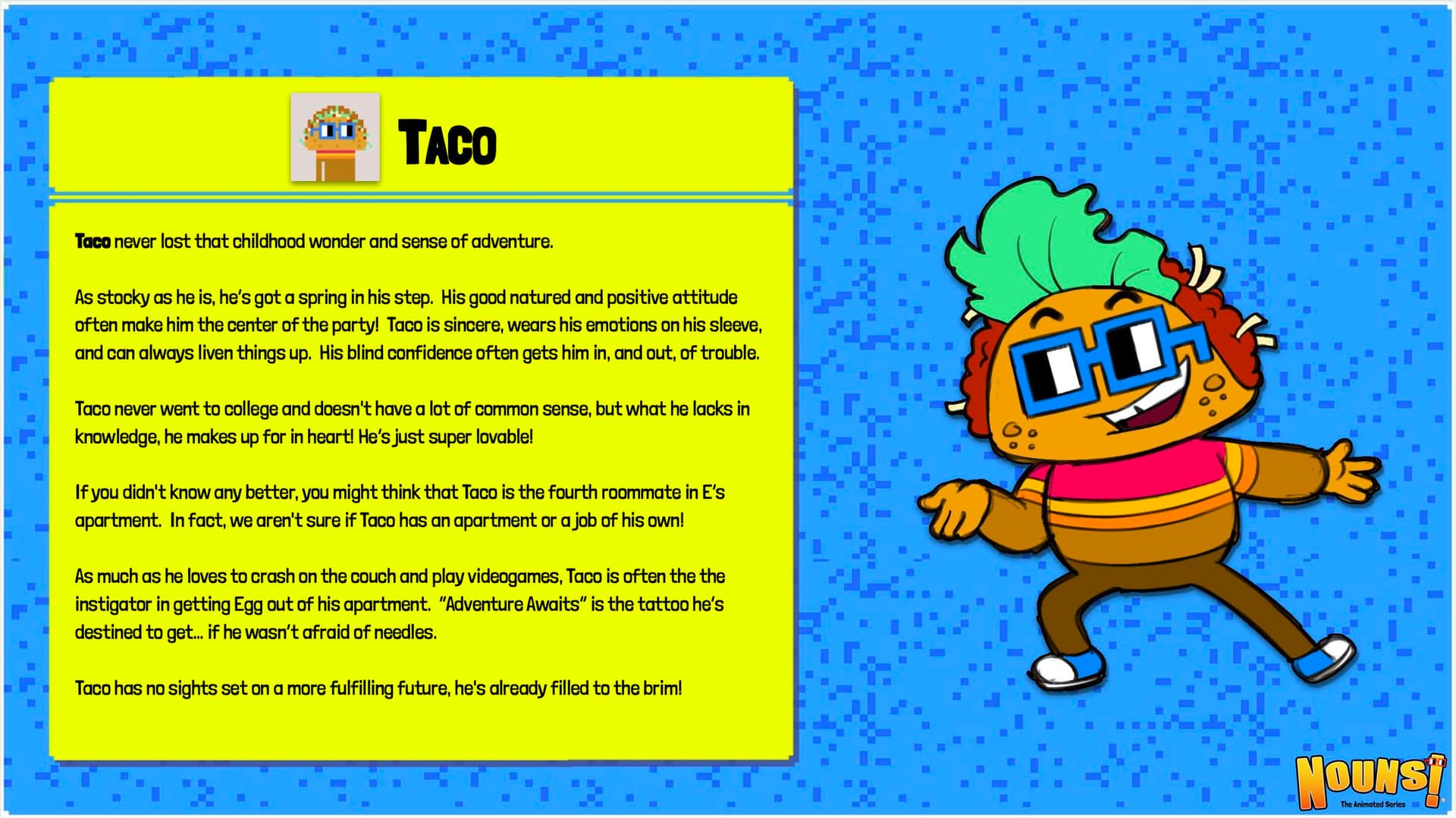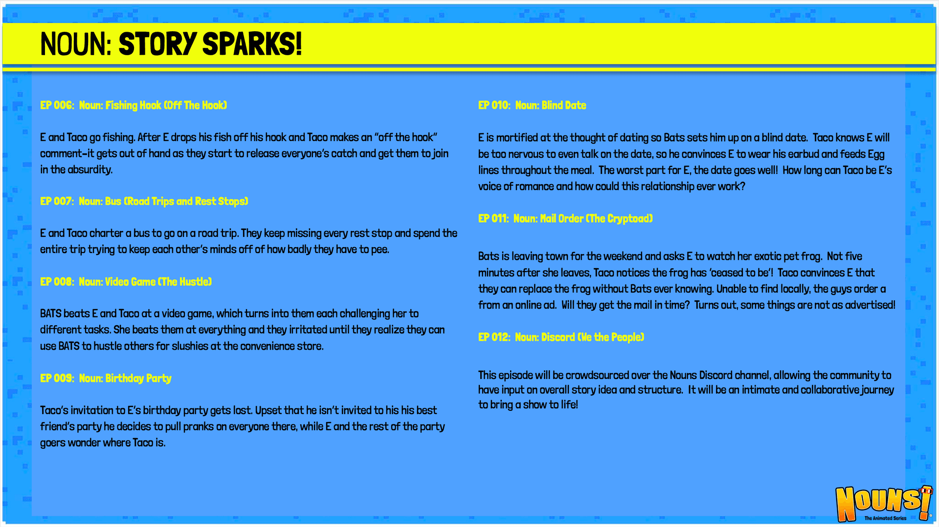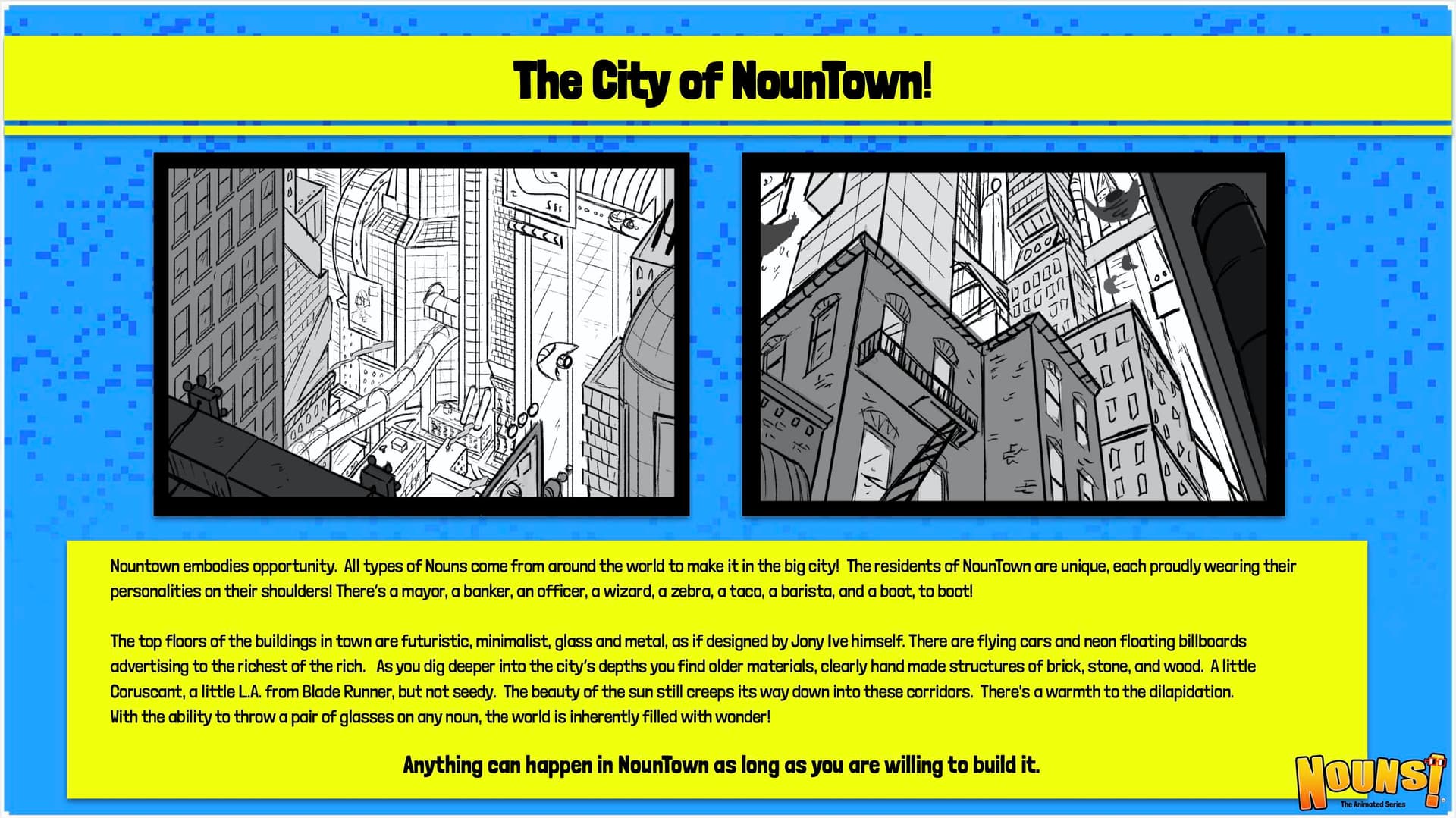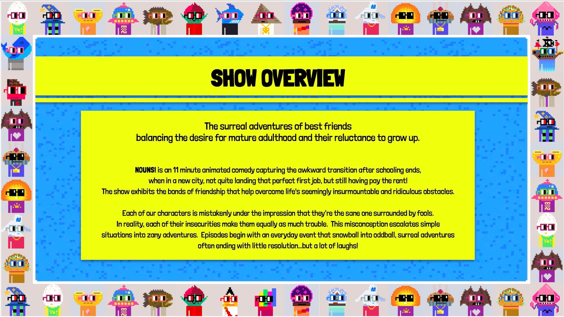 We plan to hire best-in-class artists and designers, make broadcast-quality Nounish content at an accelerated pace, and proliferate Nouns to a worldwide audience via the internet.