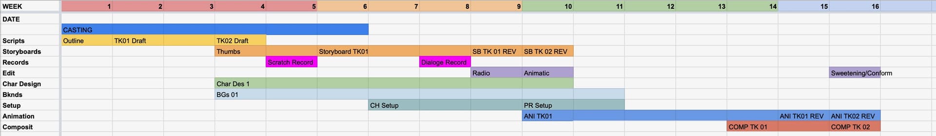 During this phase, we will thumbnail, and storyboard, refine character designs, and backgrounds, create digital puppets and record scratch tracks and audio.