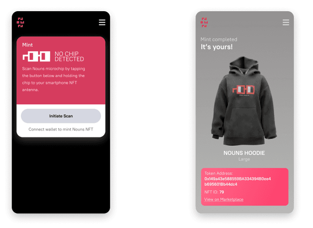 The drop will include ~500 cut-and-sew garments (including t-shirts, hoodies, and more) with cryptographic NFC microchips embedded under Nouns clothing patches, each connected via an on-chain ENS-like chip registry to a Nouns-branded NFT. A white-labeled Nouns browser app will be used for scanning the patch to claim the NFT, as well as for authenticating and verifying the garment owner and manufacturer.