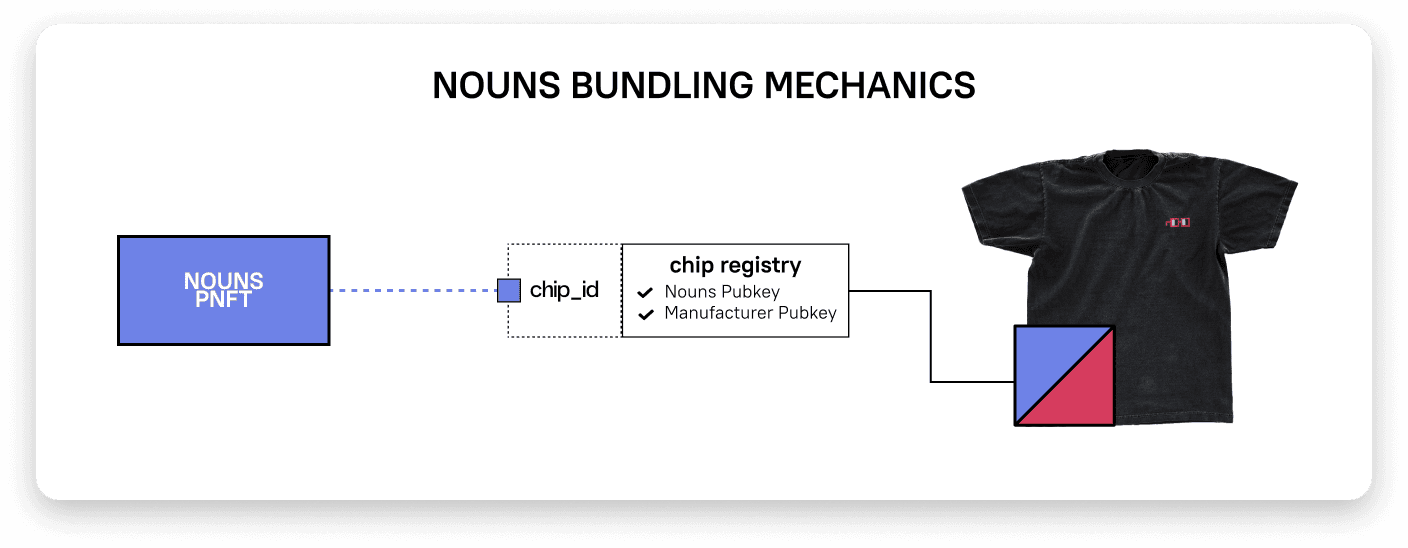 An ENS-like on-chain registry mapping chip ids to PNFTs will be used for connecting physical and digital worlds together in a truly decentralized manner. Included in each record will be a pre-registered IPFS cert provided by Nouns (e.g. an attestation signed by Nouns Deployer) and the chip manufacturer.