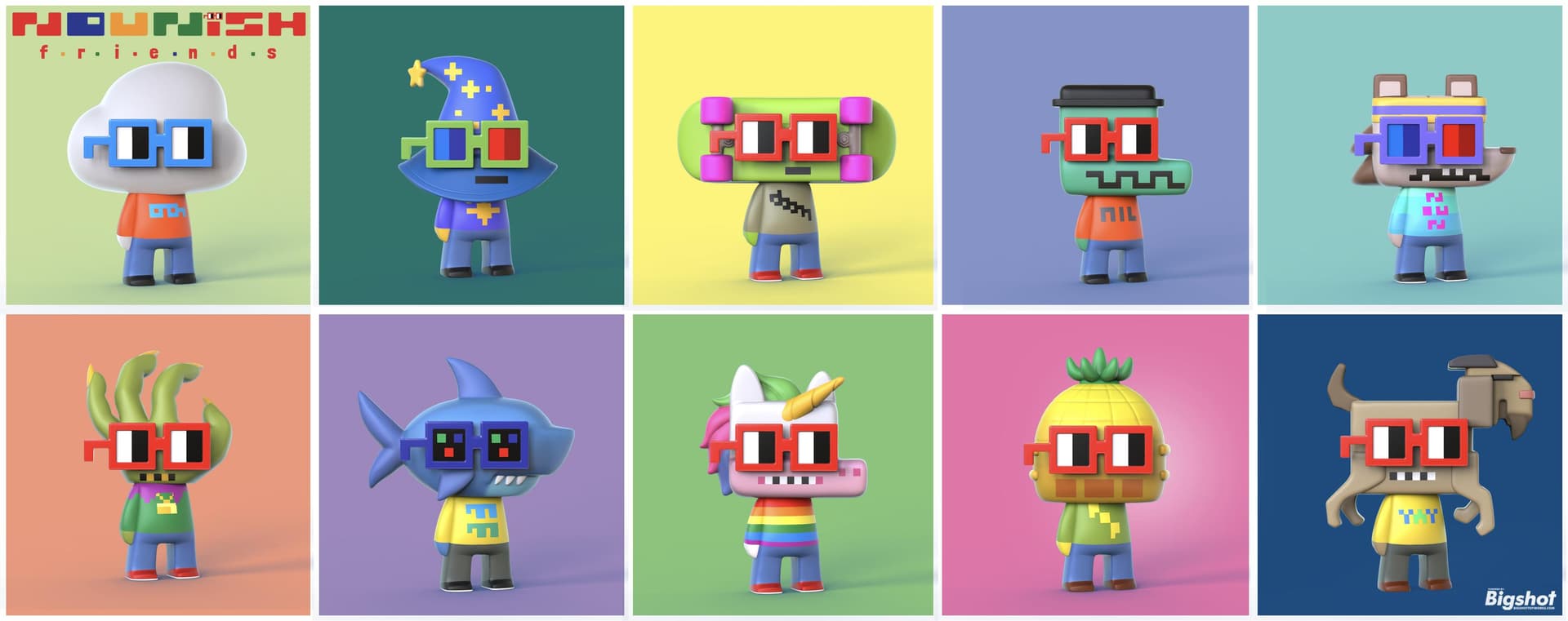 Designed for maximum NOUNish-ness, these colorful 3” tall mini figures are meant to be a fun, low cost and non-crypto-based entry point into the world of “NOUNs.” Nounish Friends will be packed into colorful mystery boxes and presented in eye catching counter display cartons which are found in shops worldwide.