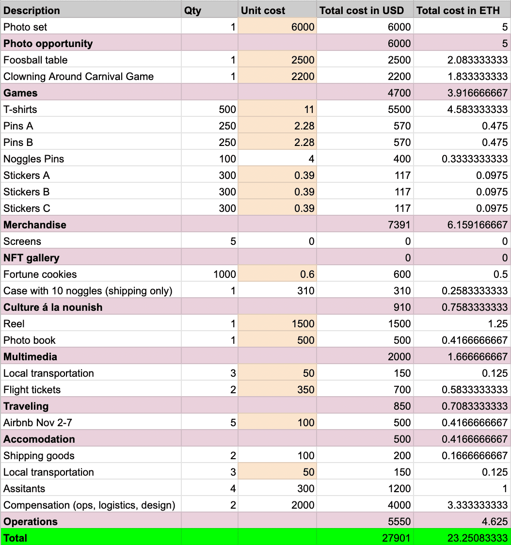 Given our past experiences and the recent Nouns Fairs at ETHMexico and ETHBogota, we came up with this budget to make it suitable for ETHSanFrancisco in the US. We are asking for 23.25 ETH.