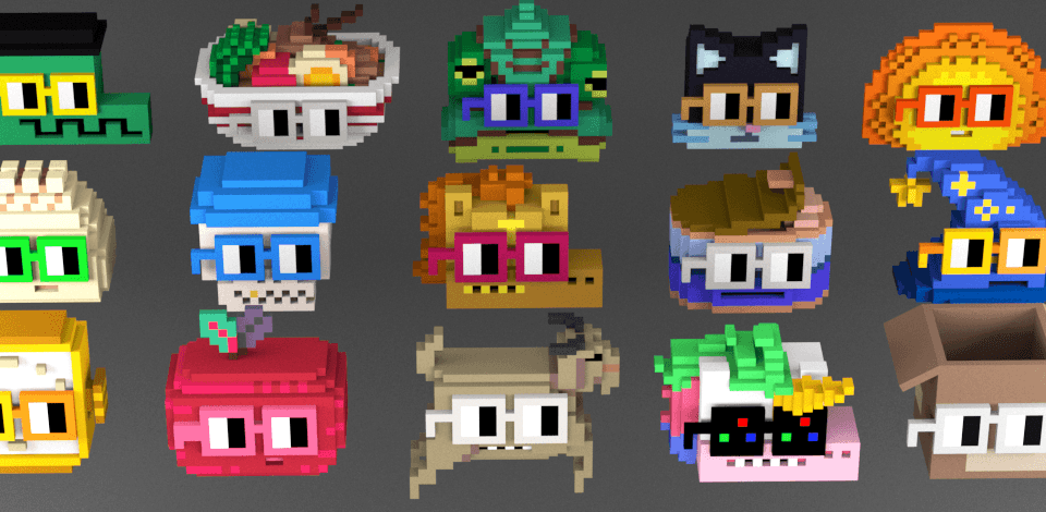 I have been optimizing this pipeline for some time, and each trait needs custom animations depending on its shape. The geometry has to be considered individually, and some traits are more challenging than others. This is a similar process to what I went through when translating all 2D Nouns to 3D voxels with 3Dnouns.com. You can speed up the pipeline with work habits and experience, but each head requires specific attention to craft the Nounish details that make the difference.