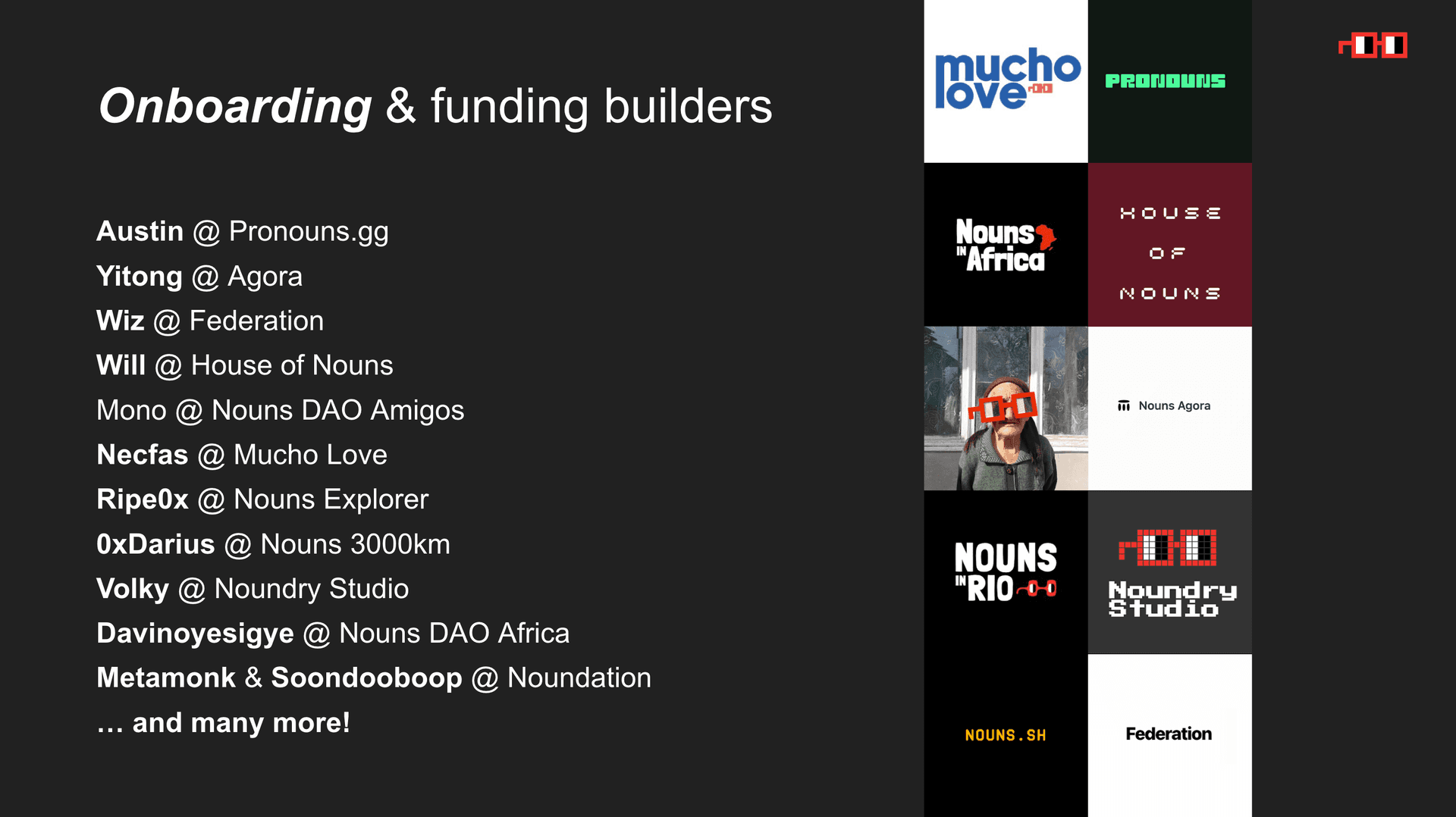 Given Nouns is about bottom-up brand building as opposed to top-down centralized direction, we hope that Prop House can continue to serve as a tool to execute on that Nouns vision. Below is a list of some of the builders who’ve been activated by Prop House: