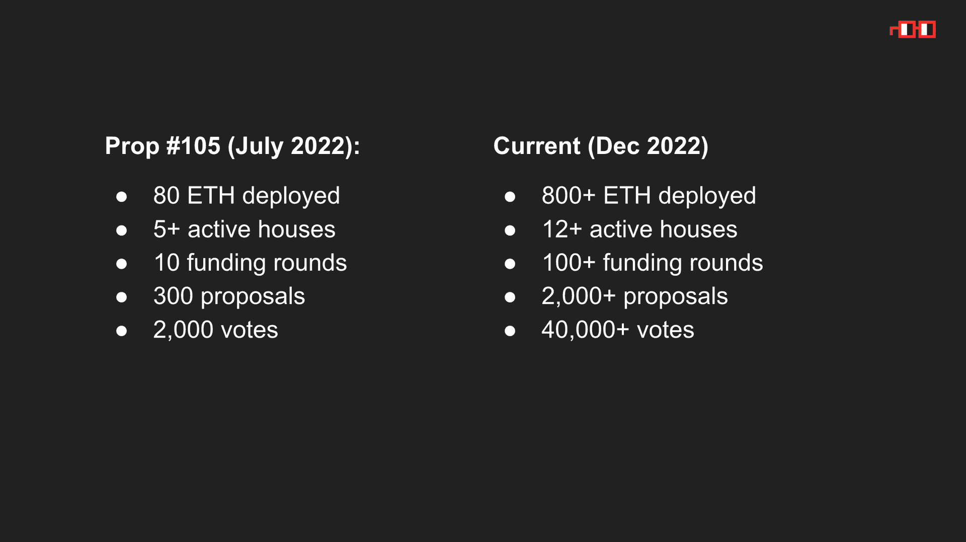 Our last proposal (#105) passed on July 18, 2022. Since then, we’ve made substantial progress on all core Prop House KPIs: