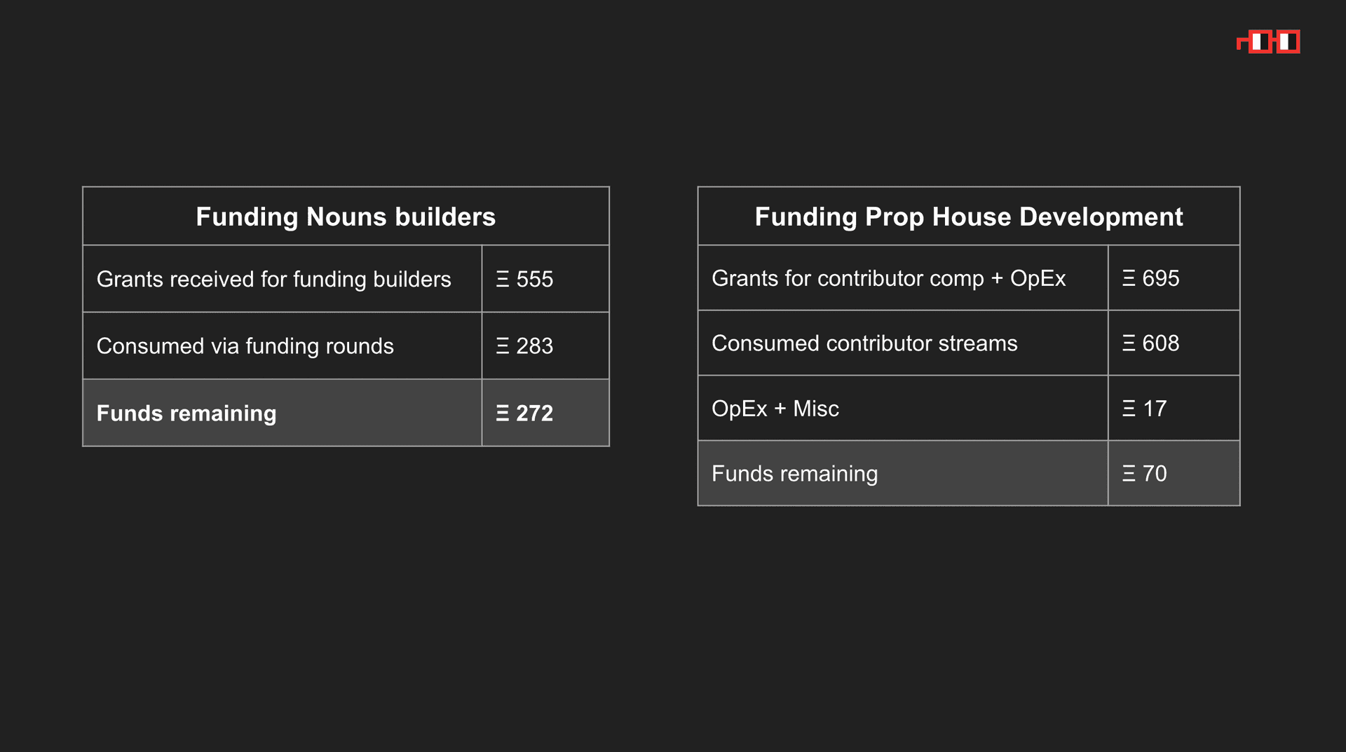 Over the course of one year and three proposals (#23, #62, #105), Nouns DAO has funded the Prop House team 555 ETH for deploying towards Nouns builders and 695 ETH for development and operating expenses.