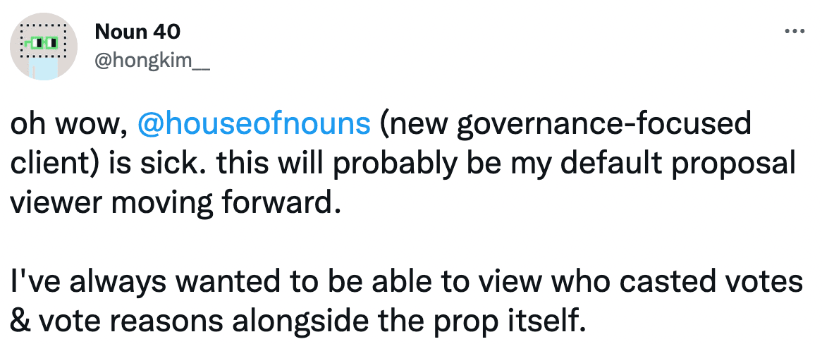 We've had early success with House of Nouns, with many Nouners and non-Nouners alike expressing their love of the intuitive interface. We want to continue building on this success and make it easier for people to participate in governance in an engaging way.