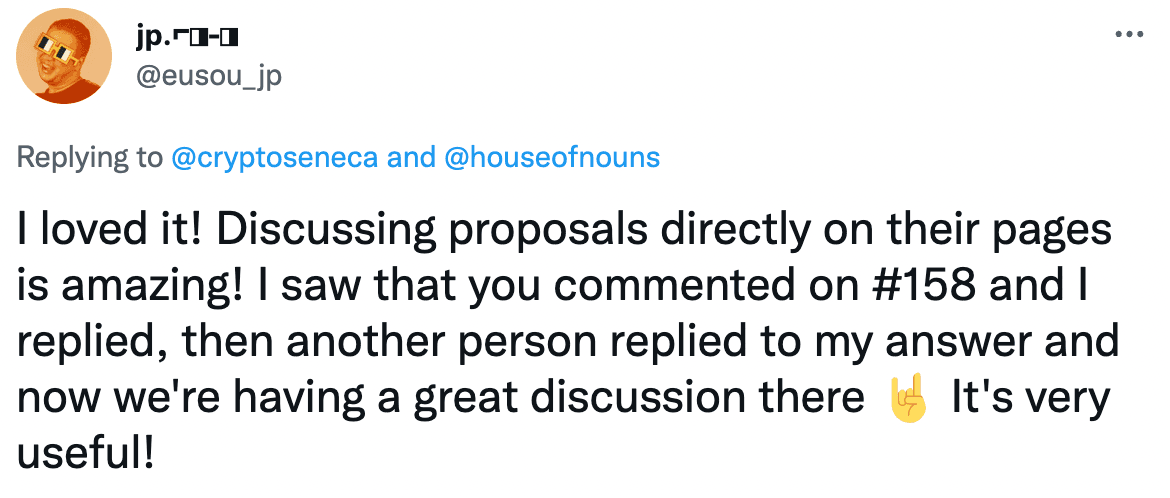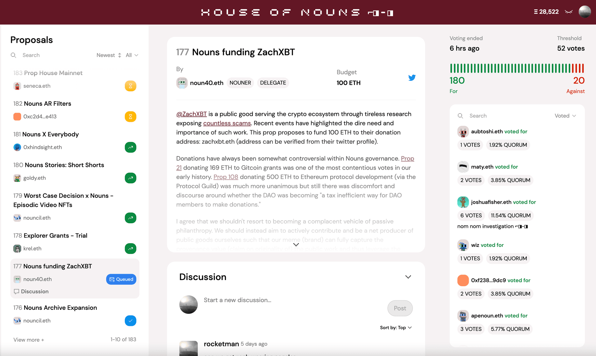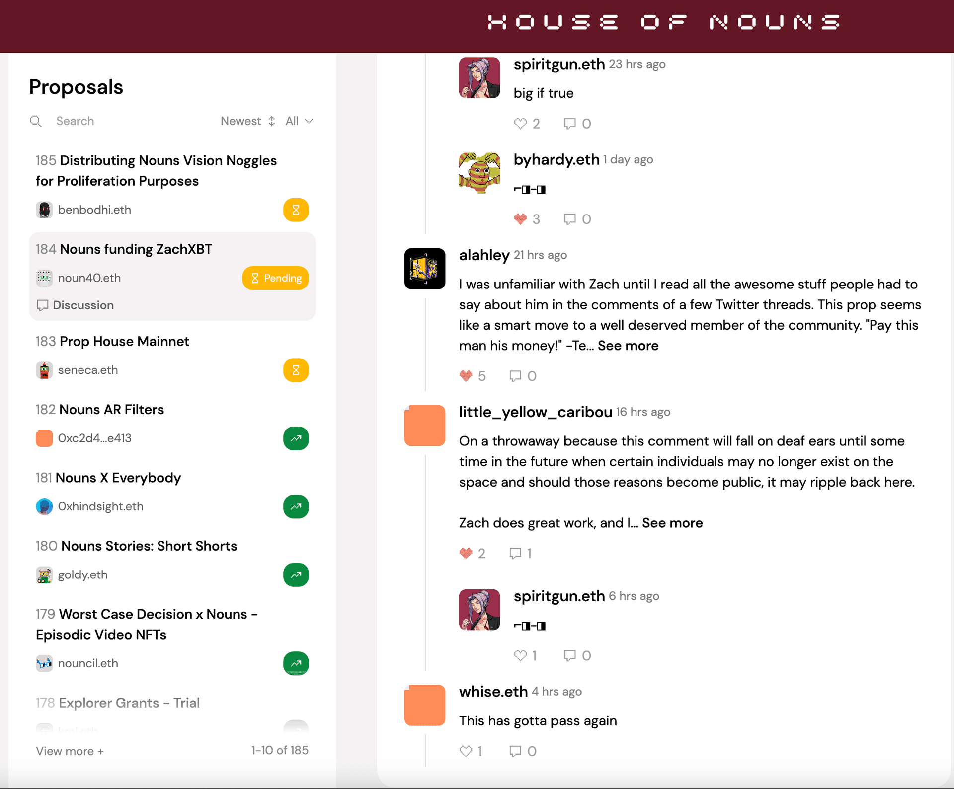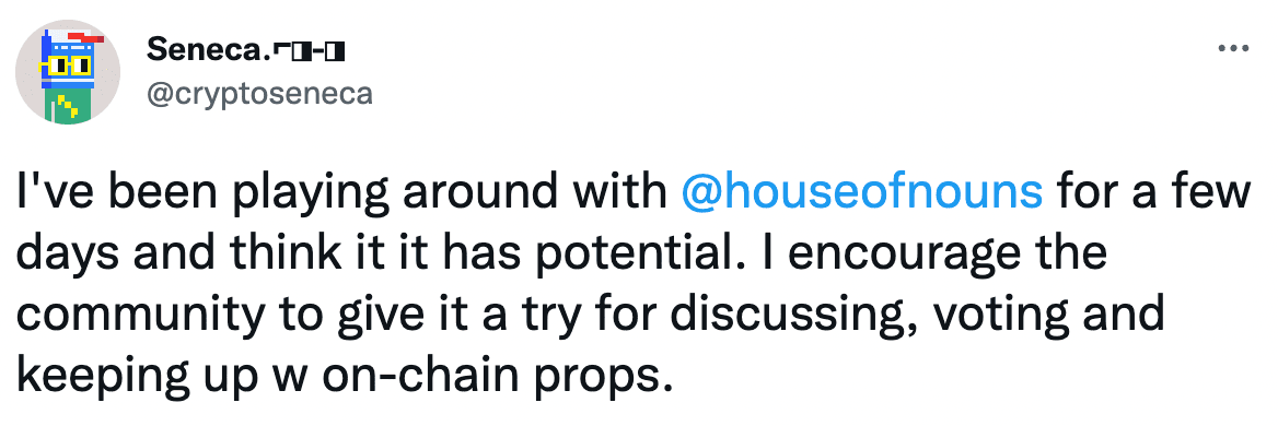 Not familiar with House of Nouns? You can discuss proposals with others, view important context, and vote all in one intuitive interface on https://houseofnouns.wtf.