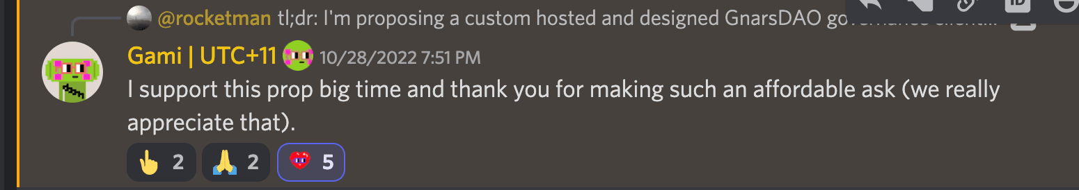 We're building an alternative forum client like Discourse that pulls data from Discourse, and integrates token signaling and Ethereum-based identities. This will be built into House of Nouns and will allow users to create and discuss proposal drafts, get early feedback, and graduate drafts to proposals. It will also provide context on builders and members, and allow token-based voting.