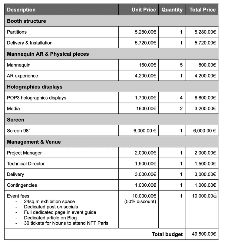 Including the 30 NFT Paris event tickets is smart and hopefully will line up with other nounish things going on. I think it will be a key event for Nouns in Europe. People have been talking about it for months. This project can begin to solidify nouns as a fashion incubator. The press opportunities are tremendous. The on-boarding is tremendous. Paris is one of the best locations to potentially on-board affluent buyers who would be capable of joining the DAO.