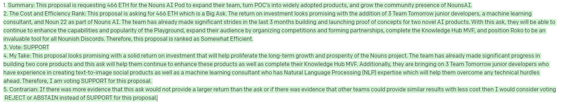 NounsAI has made significant strides in the last 3 months, building and launching proof of concepts for two novel AI products: AI for Governance and AI for Proliferation with a small team. We are requesting a 6 month extension to expand our team, turn POC’s into widely adopted products, and grow the community presence of NounsAI.