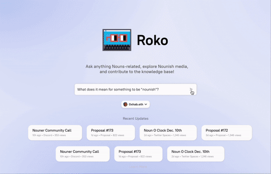 The Knowledge Hub and our AI assistant, Roko, are being developed to revolutionize the way information is shared across the DAO. With Roko, the Discord bot, and (Roko.dev)[https://roko.dev], members of the Nouns community will be able to leverage the power of artificial intelligence to improve decision-making, streamline governance processes, and drive community growth across the entire Nounish ecosystem. The Knowledge Hub will serve as the go-to resource for data and information (the ChatGPT for Nouns), with an AI-powered librarian to assist users in finding the information they need