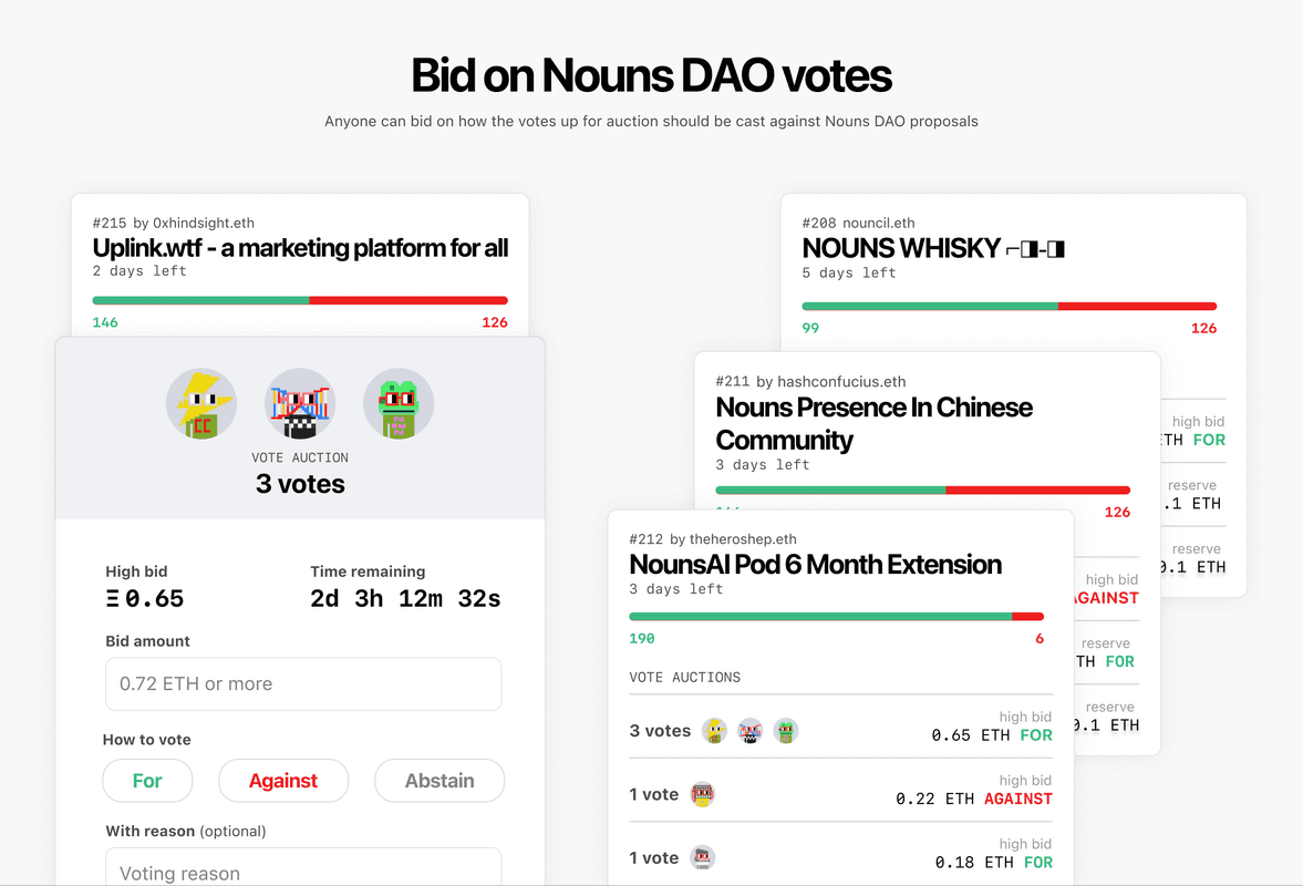 Experimentation with crossDAO governance has led to the creation of a novel vote bidding protocol aimed at giving Nouns holders the ability to monetize their governance rights. Turning the acquisition of a Noun into a revenue generating opportunity for individuals and communities alike.
