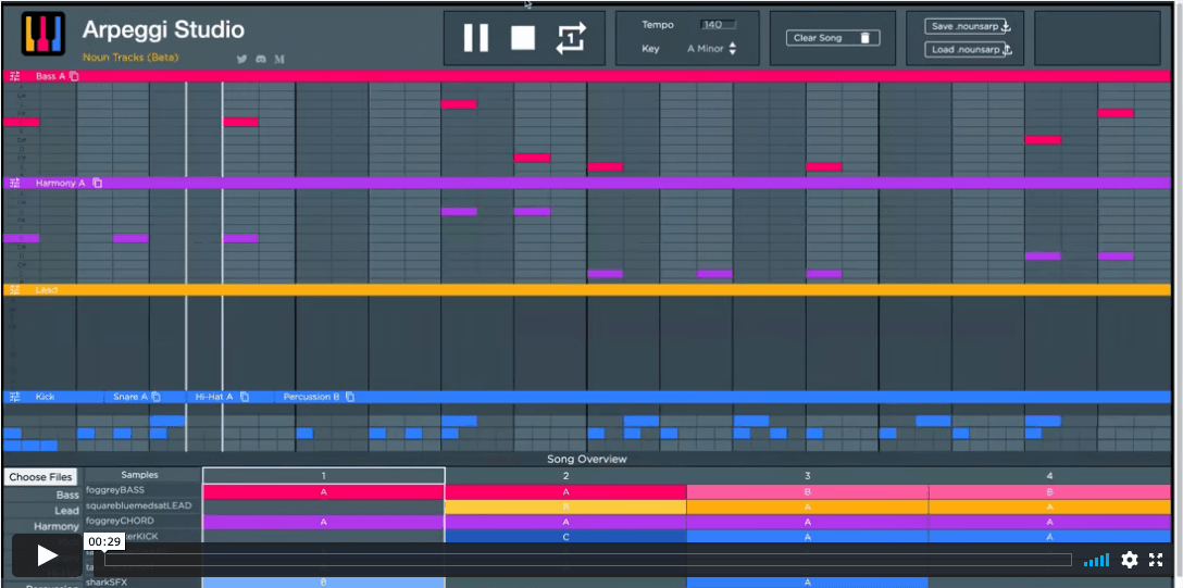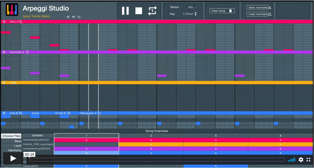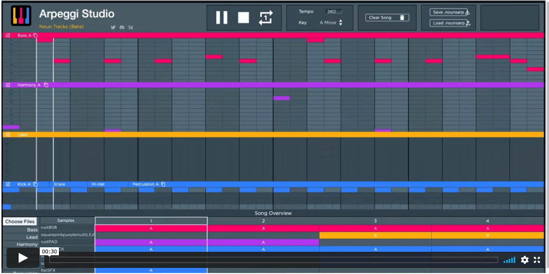 Using a custom "Noun Track Creation Contract" Arpeggi will pull the correspoding Samples and Patterns from the current Nouns features to create each days Noun Track.