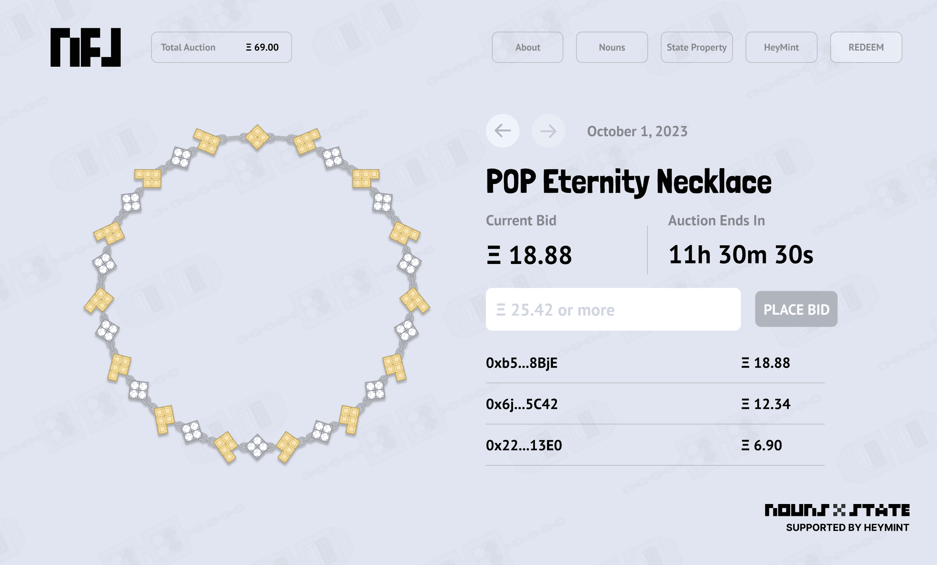 At the end of the exhibition and event, we will kickstart the online auction for the 1/1 Jewellery NFTs in Nouns-style i.e. one NFT per day. Each time an auction is settled, the settlement transaction will also cause the next NFT to be released and a new 24H auction to begin. Full proceeds from the auctions will go to the Nouns treasury.