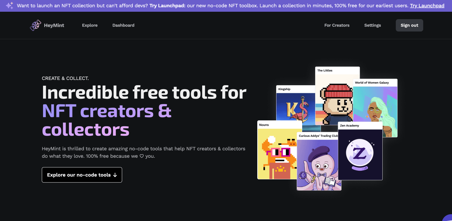 A team of creatives and developers who aims to build the best free tools available so as to help make Web3 mainstream. HeyMint are experienced technical builders and has helped major brands in the NFT space with their drops, including Zen Academy, World Of Women Galaxy, Kingship, and The Littles. Founders Mai Akiyoshi and Ben Yu are software engineers at heart and have grown their passion into a technical team who build tools for the Web3 economy.