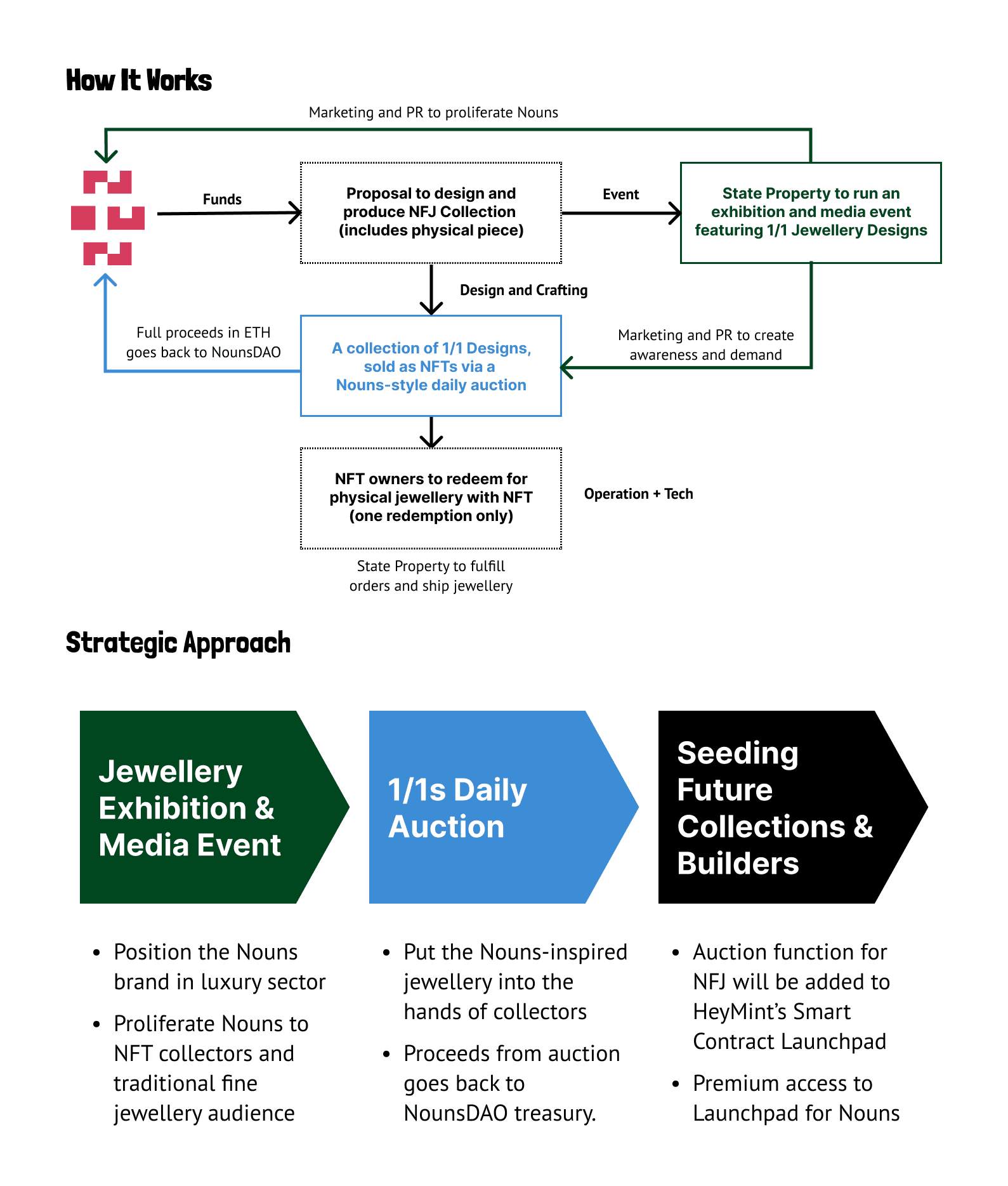tl;dr: Asking for USDC188,150 to bridge Nouns into the luxury fine jewellery scene with State Property; to create contemporary 1/1 Nouns-themed pieces sold via auction, with 100% proceeds going back to the Nouns treasury.