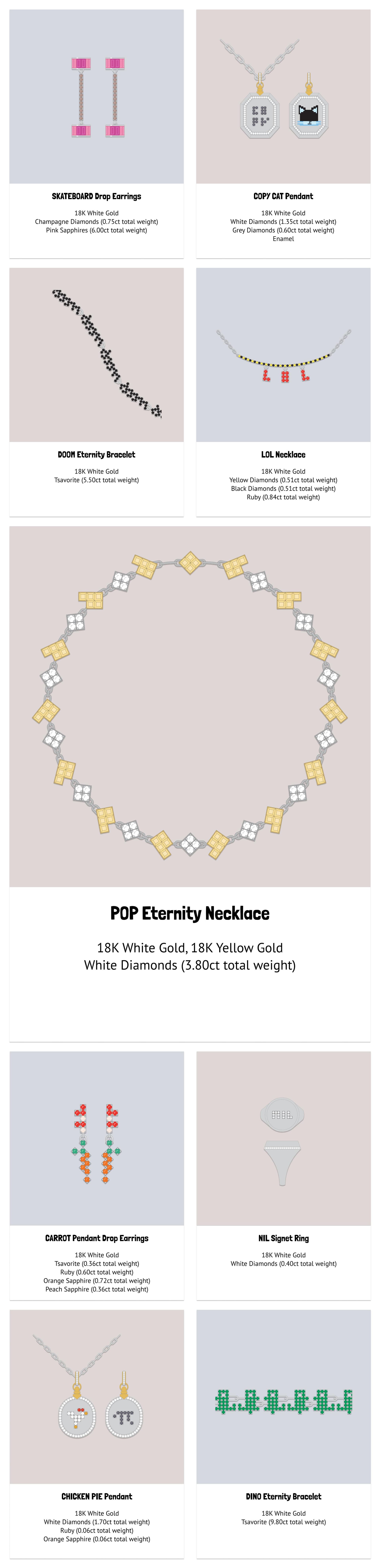 The NFJ collection embodies the vibrancy of the Noun characters. Taking cue from iconic Noun traits, the collection is an artistic expression of meme culture and Nouns culture while retaining the quintessential luxe of fine jewellery.