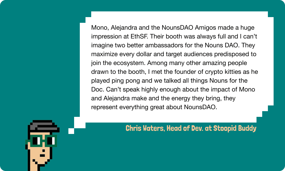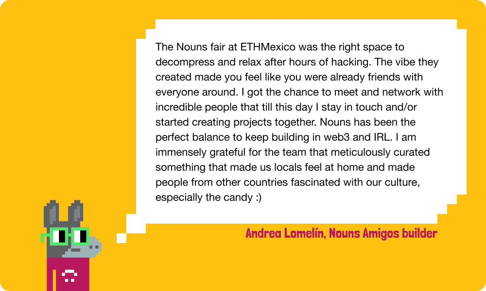 We’ve hosted three editions of the Nouns Fair at ETHGlobal hackathons: in Mexico, Colombia, and the USA. After three editions we've confirmed the importance of this kind of event to increase awareness, onboard potential builders, and put noggles in the eyes of thousands.