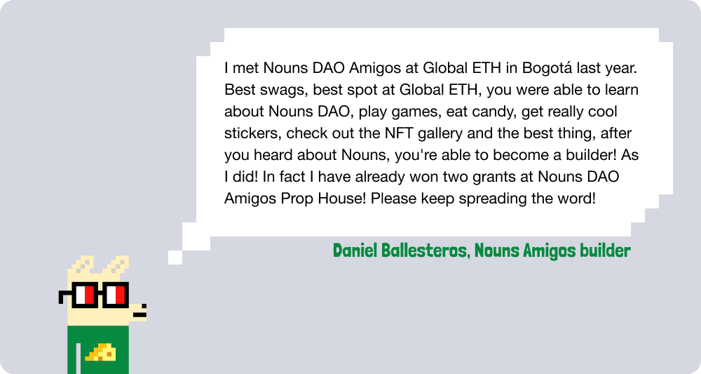 We've been active with Nouns Amigos since June 2022. We've done weekly Twitter Spaces since then (now part of the regular TNS Soapbox schedule), three editions of the Nouns Fair, and created Nouns Amigos hub in Prop House ↗︎ which has funded 19 props in two months including two breakdancers that want to qualify for the Olympics in 2024 ↗︎, a giant skateboarding noggles rail in the Dominican Republic ↗︎, these Godzilla-size Nouns in the streets of Bogota ↗︎, 8 Meetups in 5 Latam countries ↗︎, sponsored a sub-champion MBT racer ↗︎, sponsored an Ethereum Guatemala conference ↗︎ and more ↗︎!