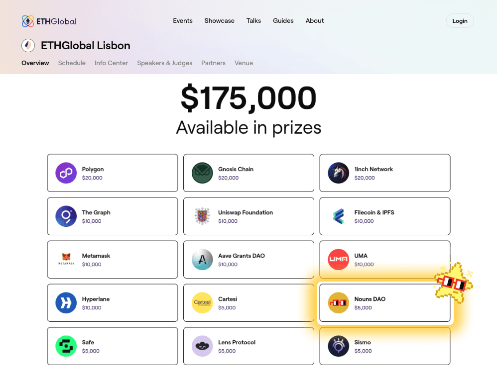 People hacking at the event will get a chance to learn about Nouns by going to the Nouns Fair inside the venue. They will learn they can build on top of Nouns immediately at the hackathon and be rewarded. This is a way to showcase the nounish vibe and incentivize the use of Nouns to build whatever they can imagine. Hundreds of hackers building with Nouns all at once like a massive Nouns Prop House flash round – can you picture that?