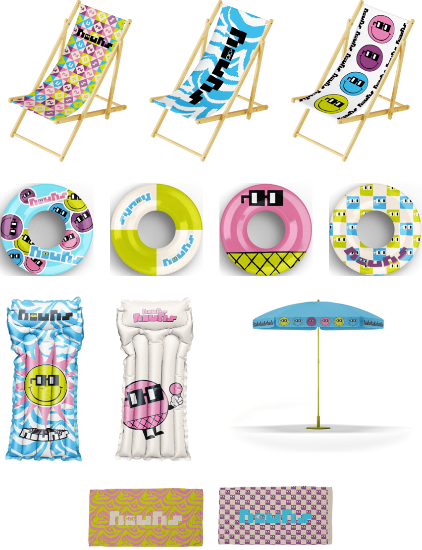 Beach, sun, and watersports have proven to fit well with the image and vibe of Nouns as Nouns have done successful proliferation through beach cleanups, crypto events in Miami/LA, and sailing competitions in Seoul and soon in NYC. An even more effective way to build upon this is to produce, distribute, and promote Nouns beach-themed wears and products for the public.