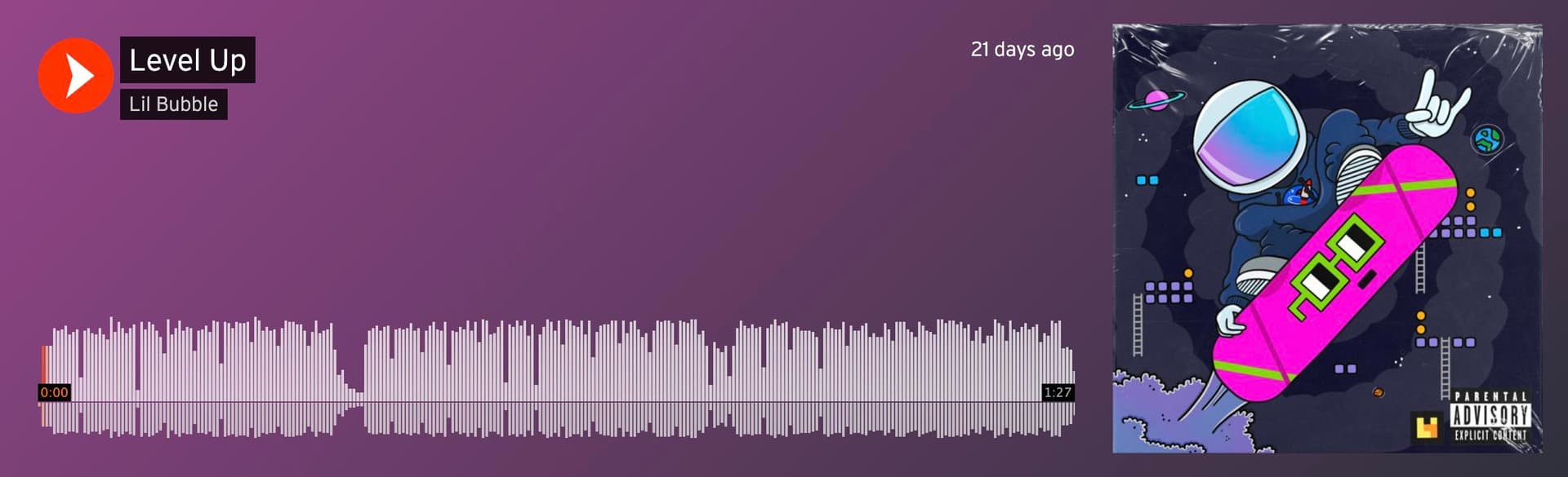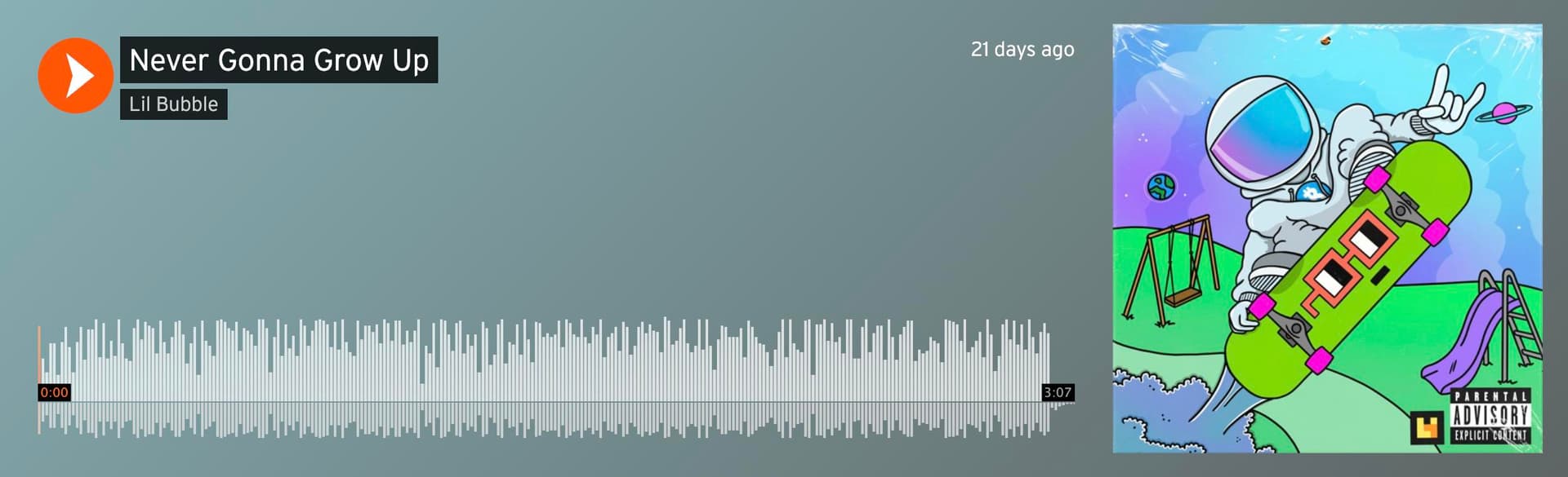 Lil Bubble grew up skateboarding and his continued support of Gnars DAO has helped us broaden our collector base. The three tracks produced for this EP have made a huge impact on our community, with "Never Gonna Grow Up" having already found its place as our anthem.