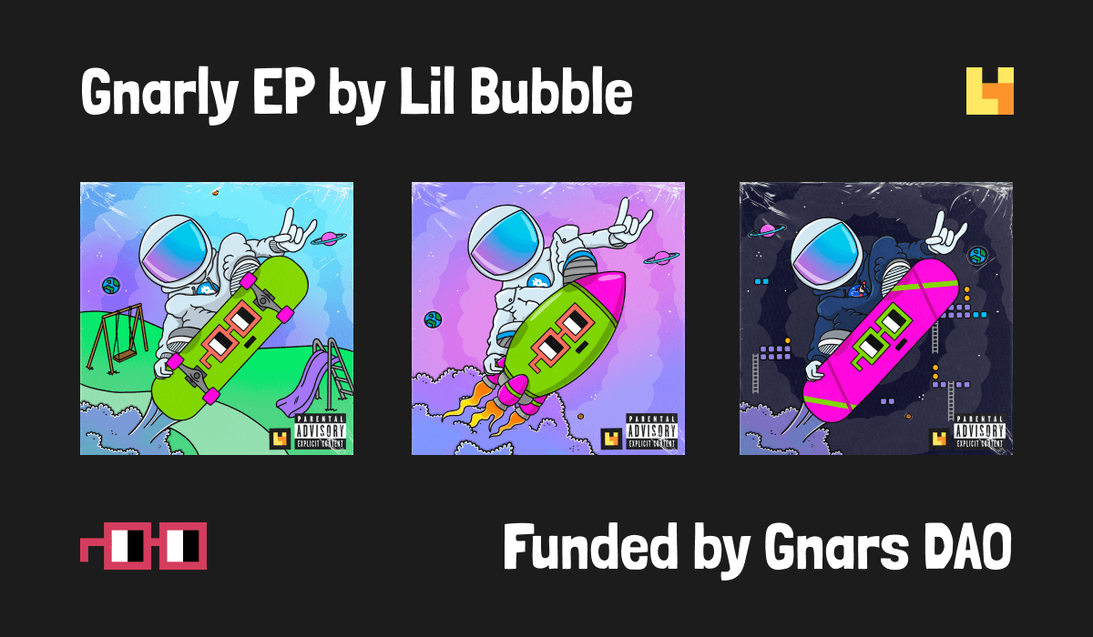 Gnarly EP is a three track release by Lil Bubble, an extremely nounish recording artist and Gnars DAO member. These original songs were commissioned by Gnars for 3 ETH and this droposal marks our official CC0 release of the music and cover art.