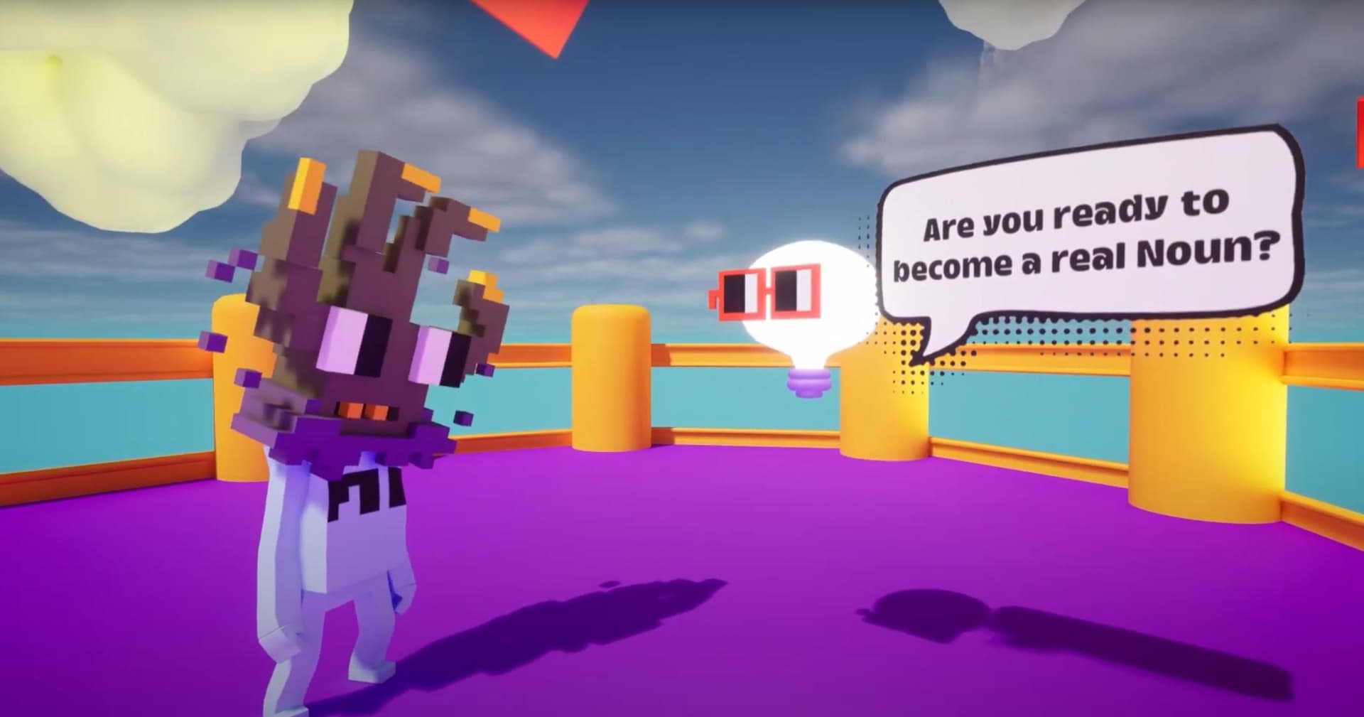 The player controls their noun throughout each level in a 3D playground. Nouns can run, jump, grab, climb, dive + more to overcome the obstacles until the final point is reached and the noun goes through the gate to get minted.