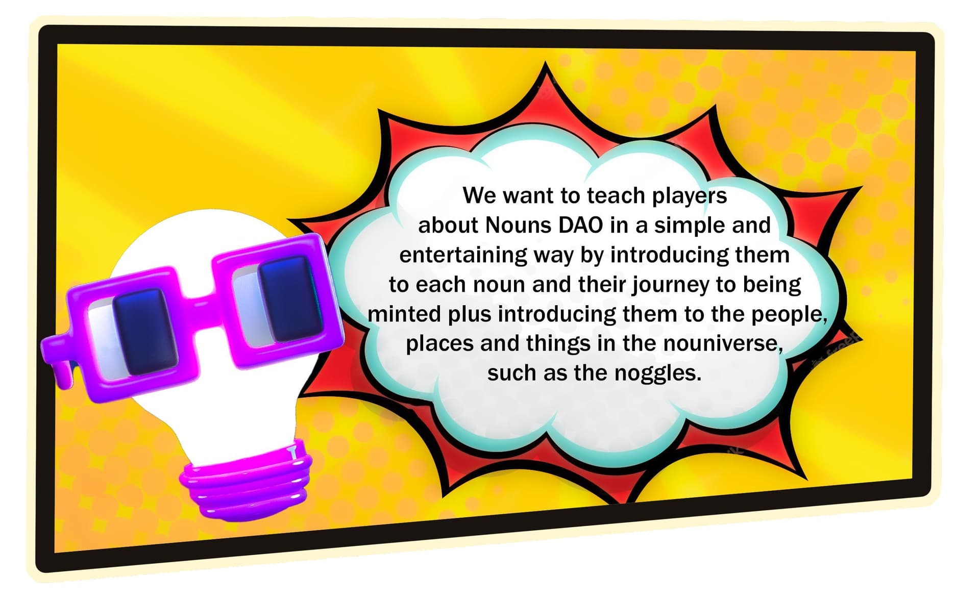Some stages of the game are designed to indirectly teach players about the Nounish culture and the NounsDAO mechanism. Players will be enticed to go through these stages in order to obtain valuable rewards, and in the process, they will come across learning opportunities to grasp these concepts. We believe that direct teaching of these concepts might not be engaging for players, so we aim to make the learning experience more fun and interactive through gameplay.