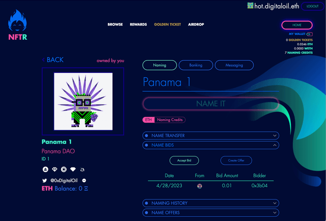Let’s name JellO so that it joins the club and gets its own NFTR domain (.nftr) and profile page accesible by name: