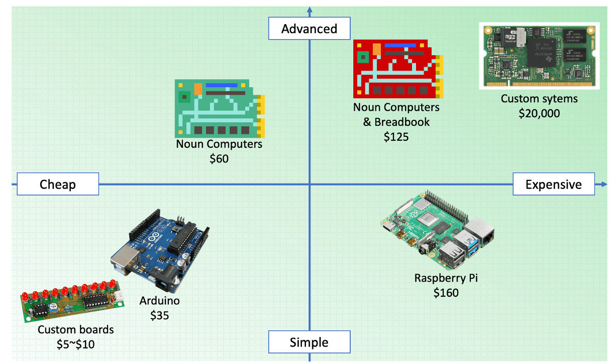 The Noun-Computer will compete in performance and price with raspberry pi and arduino boards. The devices will be sold via a fixed price policy to ensure that end users do not overpay.