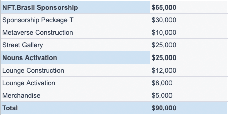 Lounge activation during the 3-day event - During the three-day event, three members of Nouns BR will be entirely dedicated to onboarding new users. They will take care of the space and ensure the best possible delivery for Nouns. This value will cover the costs of travel, transportation, food, and lodging. - $ 8.000,00