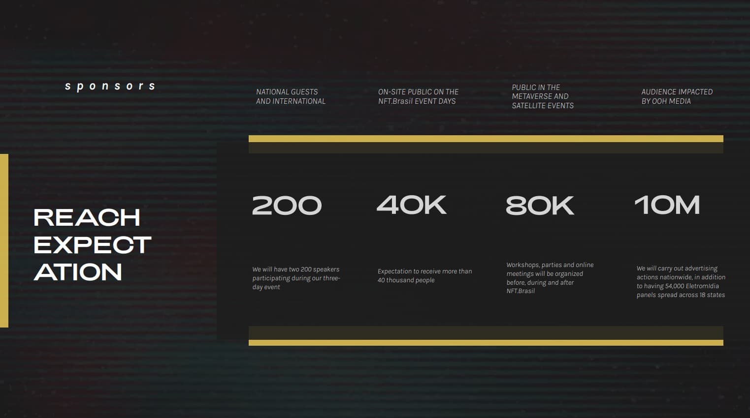 For 20 days, NFT.Brasil will host the largest open-air NFT exhibition in the world. In partnership with Eletromedia, Brazil's leading Out of Home media company, NFT.Brasil will showcase artists' works at over 40,000 media spots throughout the cities of São Paulo, Rio de Janeiro, Belo Horizonte, and Fortaleza.