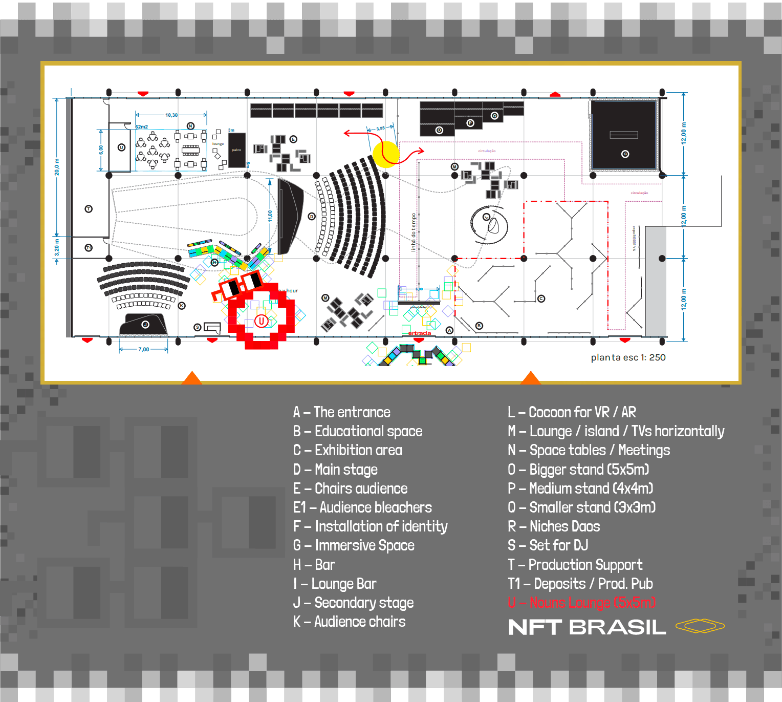 Our goal is to achieve a massive and innovative onboarding experience for all attendees, and to do so, we will be present in five strategic areas throughout the event journey. These include the NFT Exhibition, Speaker Sessions, Lounge, Metaverse, and Street Gallery (Eletromedia OOH advertising).