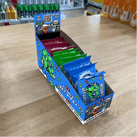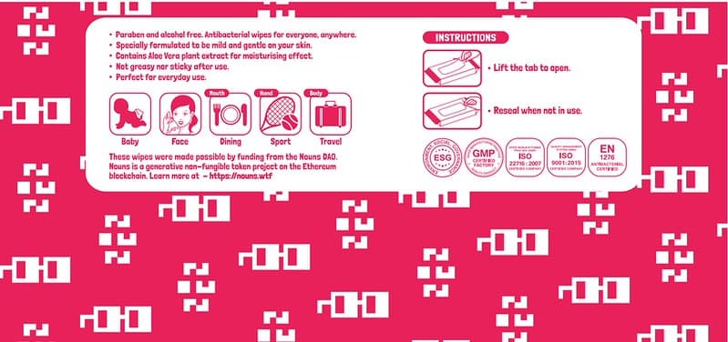 Create the first Noun’s branded Fast Moving Consumer Goods (FMCG) that can be sold at almost all types of retail outlets to increase brand awareness. Nouns Wet Wipes will become a permanent item in the market after this initial investment of USD 31,450 + 2 ETH (up from USD 19,050 prop 265).