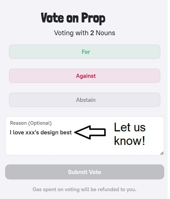 The judges of this contest would be the DAO itself so please choose which design you like best and let us know in the ‘Reason’ section when you vote. We will also take into account ‘Against’ votes if you did choose the design you like. 1 noun 1 vote.