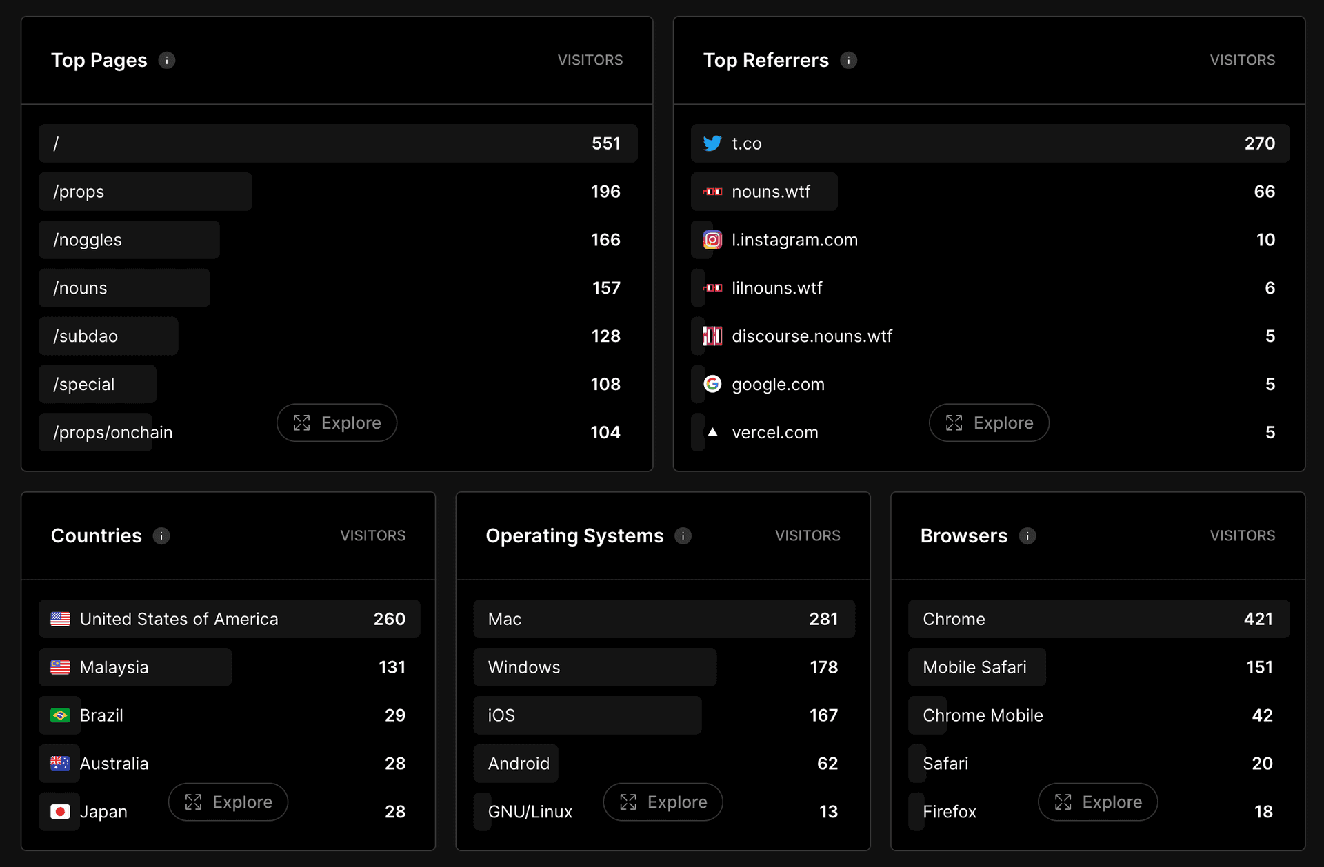 We believe data transparency is important for the DAO & community. We are using Vercel's Web Analytics to get detailed insights. It provides in-depth information about your website's visitors, new metrics like top pages, top referrers, and demographics including information on countries, operating systems, and browsers.