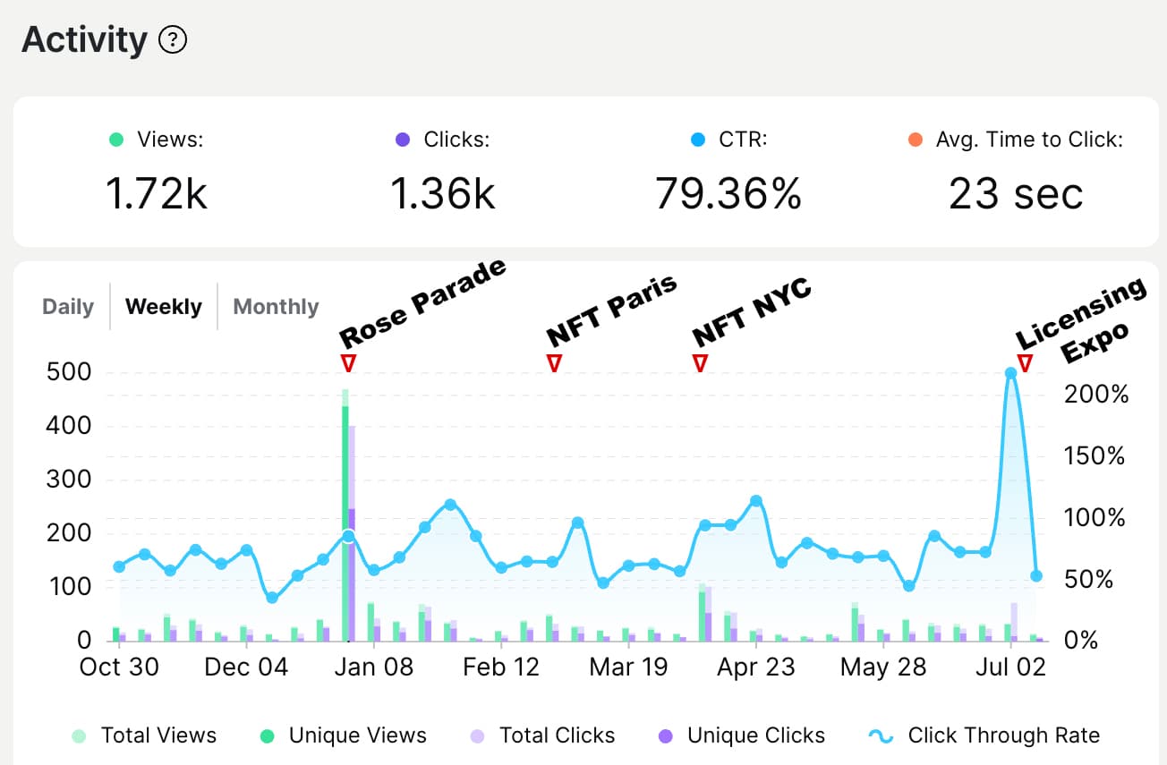 We see similar spikes just after NFT Paris & NFT NYC dates, and the Licensing show in late June had a significant click-through spike because we instructed people to scan the QR code on site. (LoFi Noggles were also handed out at each of those events).