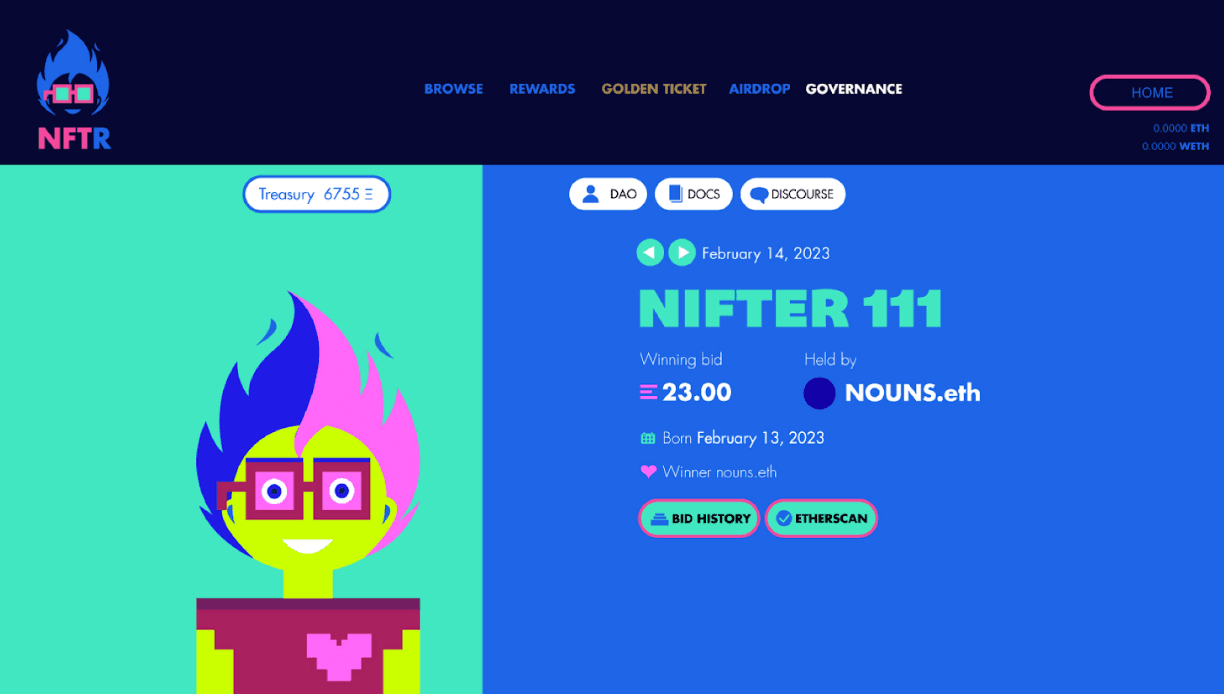 NFTR, the first and only NFT Naming Registry on Ethereum, is requesting 80 ETH to seed its Nounish DAO Treasury. In Nounish DAO fashion, 1 daily NFT = 1 vote, will determine NFTR funding initiatives. In return for the funding, Nouns DAO will receive 10% of the supply in perpetuity. In addition, NFTR will direct 5% of daily auction proceeds to the Nouns DAO treasury up to 80 ETH.
