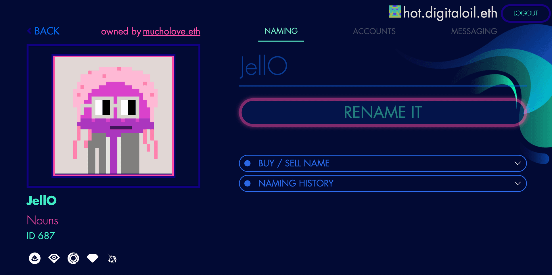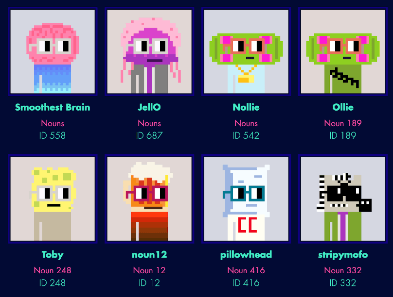 Nouns that have been named on NFTR. JellO.nftr is the Nouns DAO-owned Noun that was named on NFTR via Prop 280. JellO can be interacted with by visiting jello.nftr.name in any web browser.