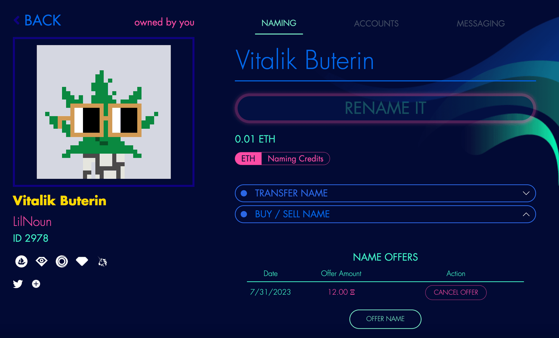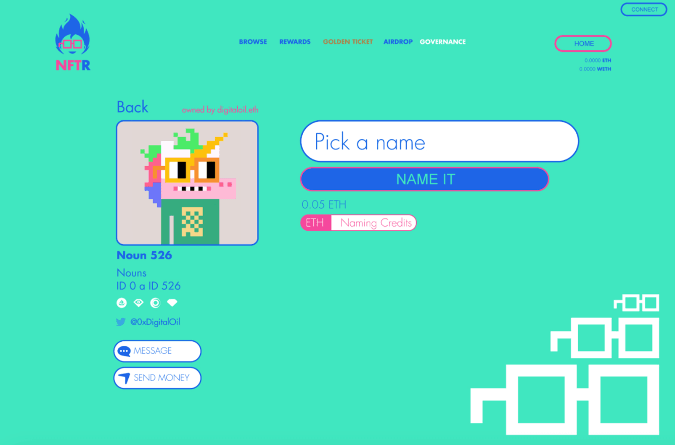 Supply every Nouns NFT (forever) with a Naming Credit (existing and future), good for a free name + associated NFTR Profile (accessible by [name].nftr.name). This includes development of a PR into the nouns.wtf front-end to facilitate naming upon auction settlement