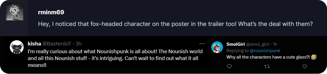 Check out the excitement! People can't stop asking about the intriguing world of 'Nounishpunk' and its unique connection to the Nouns DAO. See how curiosity is piqued and interest is sky-high. It's clear that the Nouns culture is sparking intrigue far and wide through the Nounishpunk game.