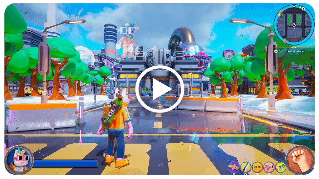 In the game, our protagonist rides a skateboard inspired by 'Gnars,' showcasing incredible tricks along the edges of 'Noggle Chairs.' He reenergizes with 'Public Good' drinks for that extra turbo boost while tackling side-missions and achievements intricately connected with 'ComicsDAO.' All of this unfolds within a futuristic cityscape adorned with Nounish art, particularly when equipped with the stylish 'Nouns Factory-Style' shirt and Nounish weapons that can be customized with decals from 'Stickers.fun.'
